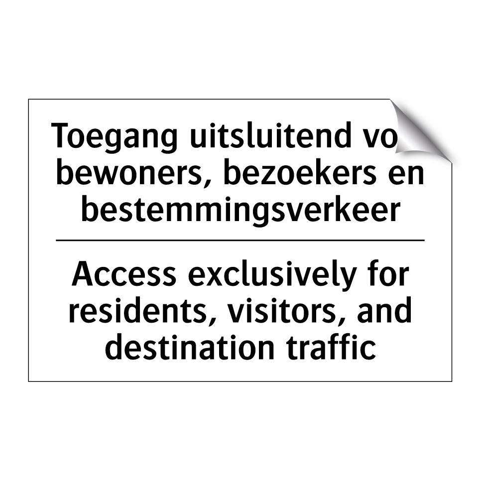 Verbodsbord met de tekst Toegang uitsluitend voor bewoners, bezoekers en bestemmingsverkeer en in het Engels: Access exclusively for residents, visitors, and destination traffic