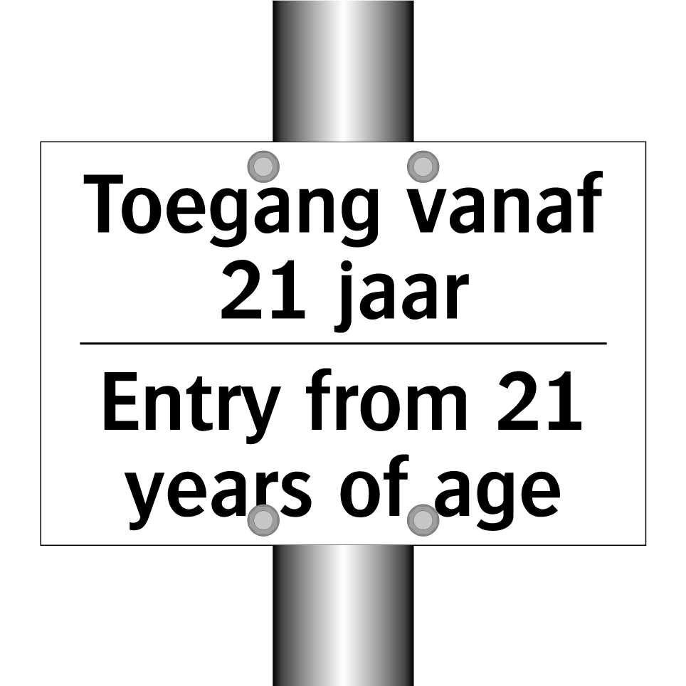 Verbodsbord met de tekst Toegang vanaf 21 jaar en in het Engels: Entry from 21 years of age