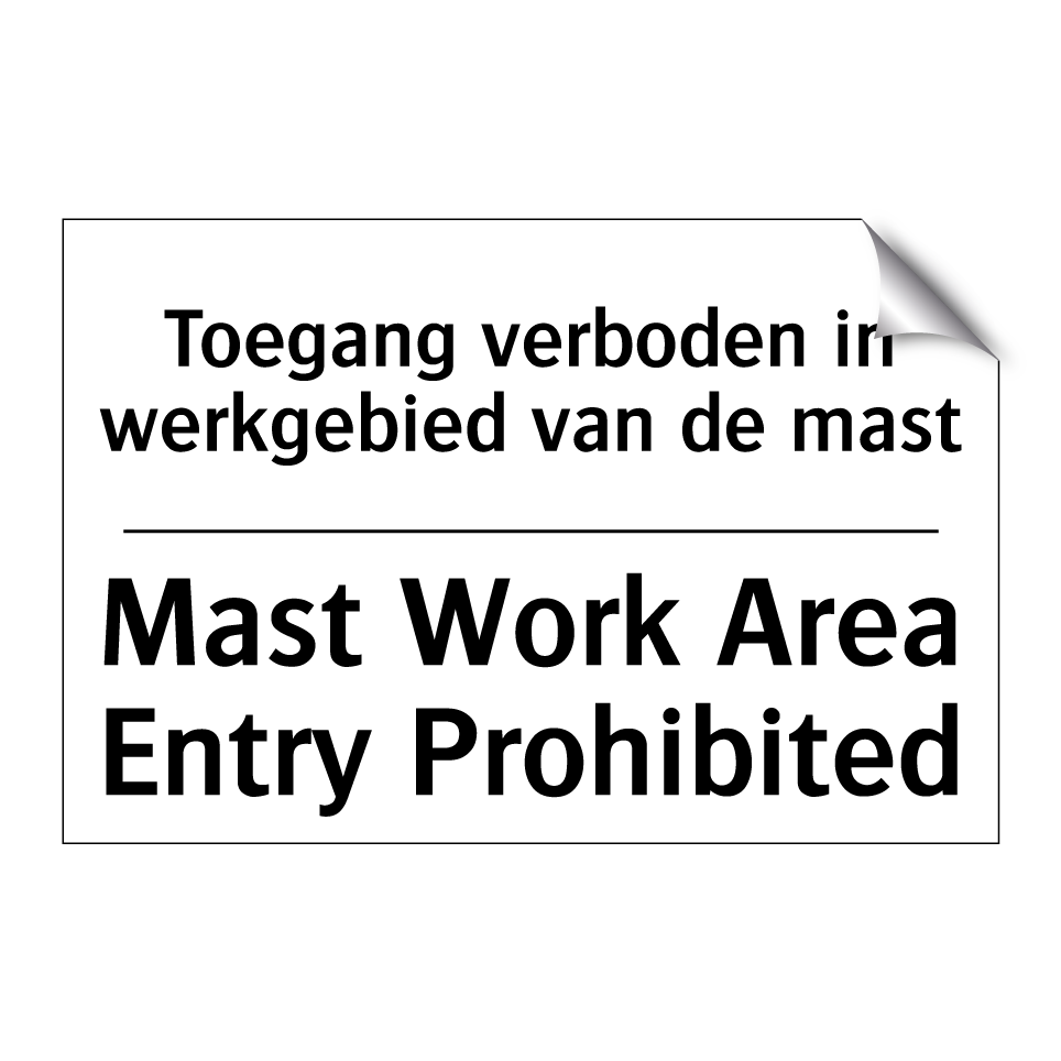 Verbodsbord met de tekst Toegang verboden in werkgebied van de mast en in het Engels: Mast Work Area Entry Prohibited