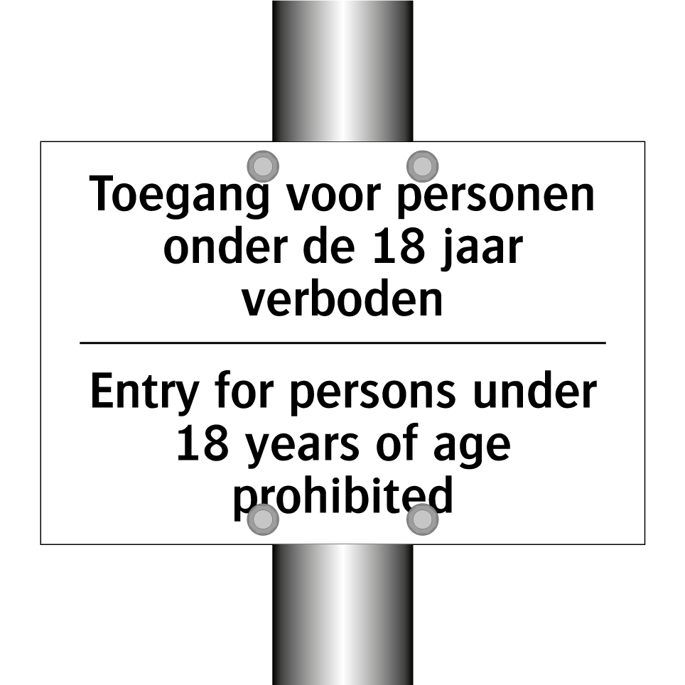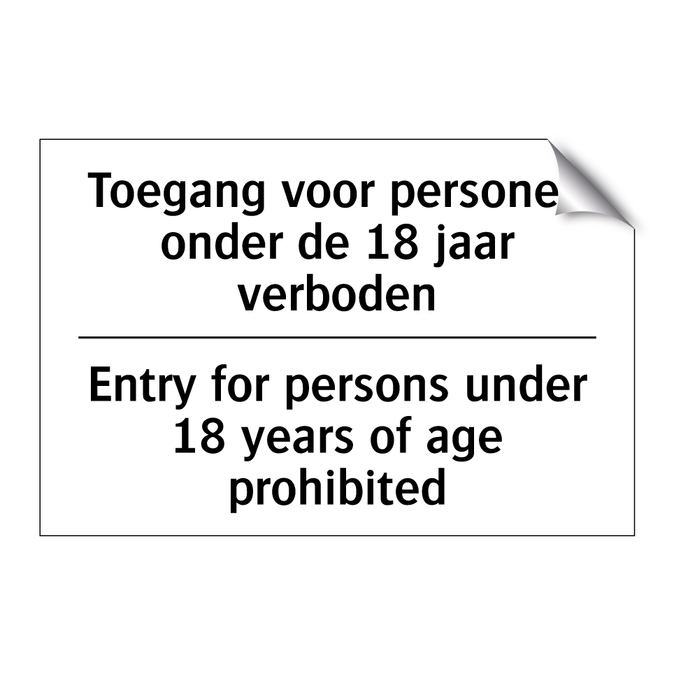 Verbodsbord met de tekst Toegang voor personen onder de 18 jaar verboden en in het Engels: Entry for persons under 18 years of age prohibited
