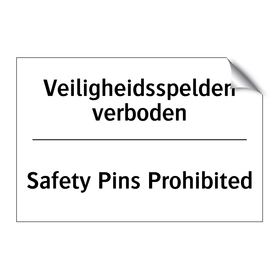 Verbodsbord met de tekst Veiligheidsspelden verboden en in het Engels: Safety Pins Prohibited