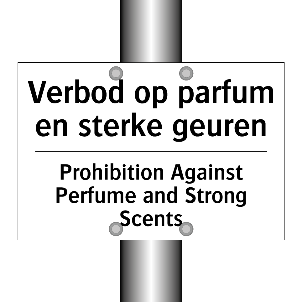 Verbodsbord met de tekst Verbod op parfum en sterke geuren en in het Engels: Prohibition Against Perfume and Strong Scents