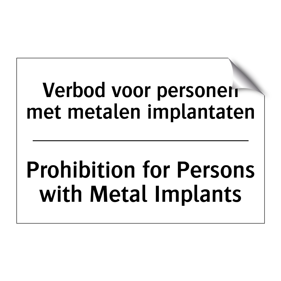 Verbodsbord met de tekst Verbod voor personen met metalen implantaten en in het Engels: Prohibition for Persons with Metal Implants