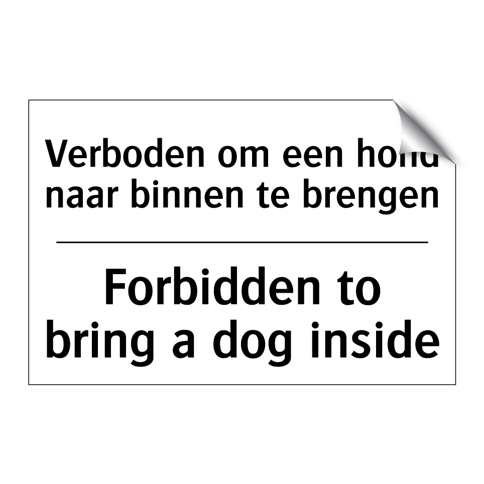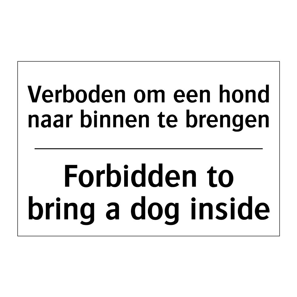 Verbodsbord met de tekst Verboden om een hond naar binnen te brengen en in het Engels: Forbidden to bring a dog inside