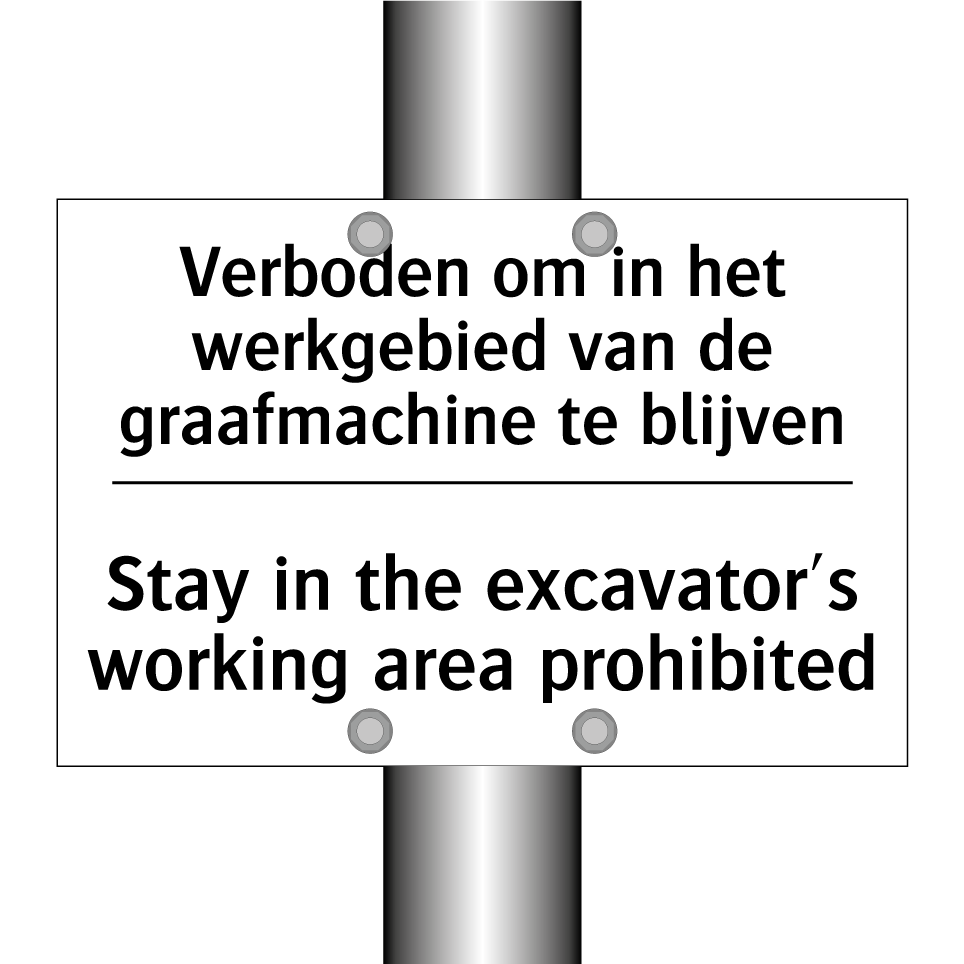Verbodsbord met de tekst Verboden om in het werkgebied van de graafmachine te blijven en in het Engels: Stay in the excavator's working area prohibited