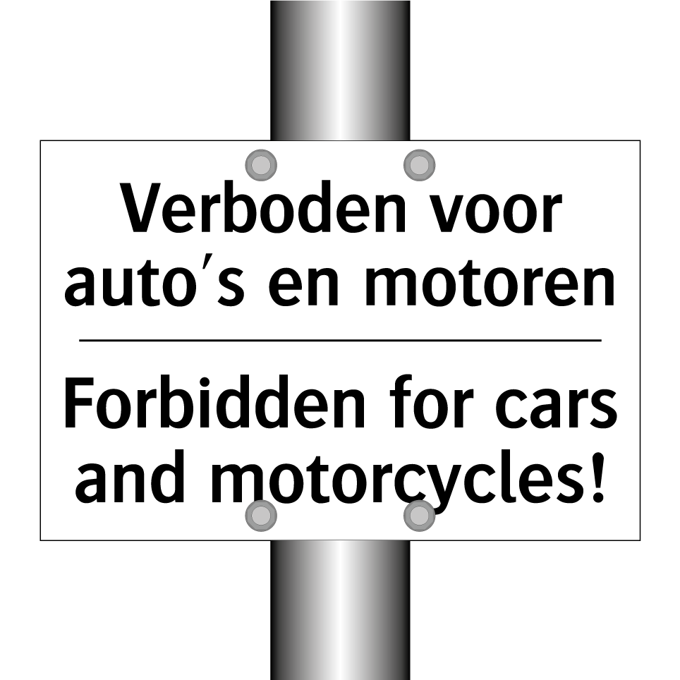 Verbodsbord met de tekst Verboden voor auto's en motoren en in het Engels: Forbidden for cars and motorcycles!