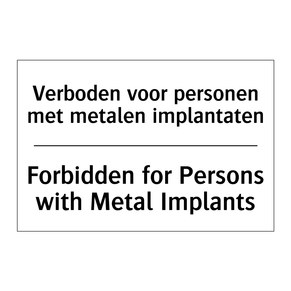 Verbodsbord met de tekst Verboden voor personen met metalen implantaten en in het Engels: Forbidden for Persons with Metal Implants