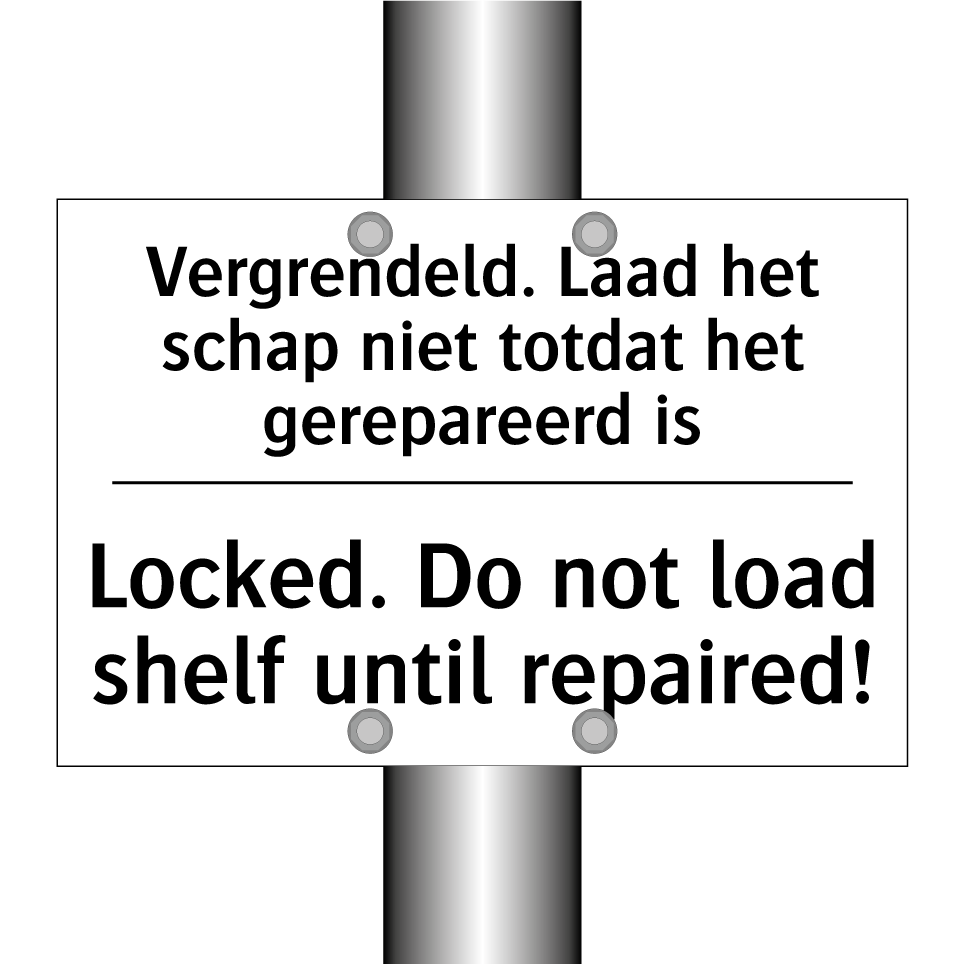 Verbodsbord met de tekst Vergrendeld. Laad het schap niet totdat het gerepareerd is en in het Engels: Locked. Do not load shelf until repaired!