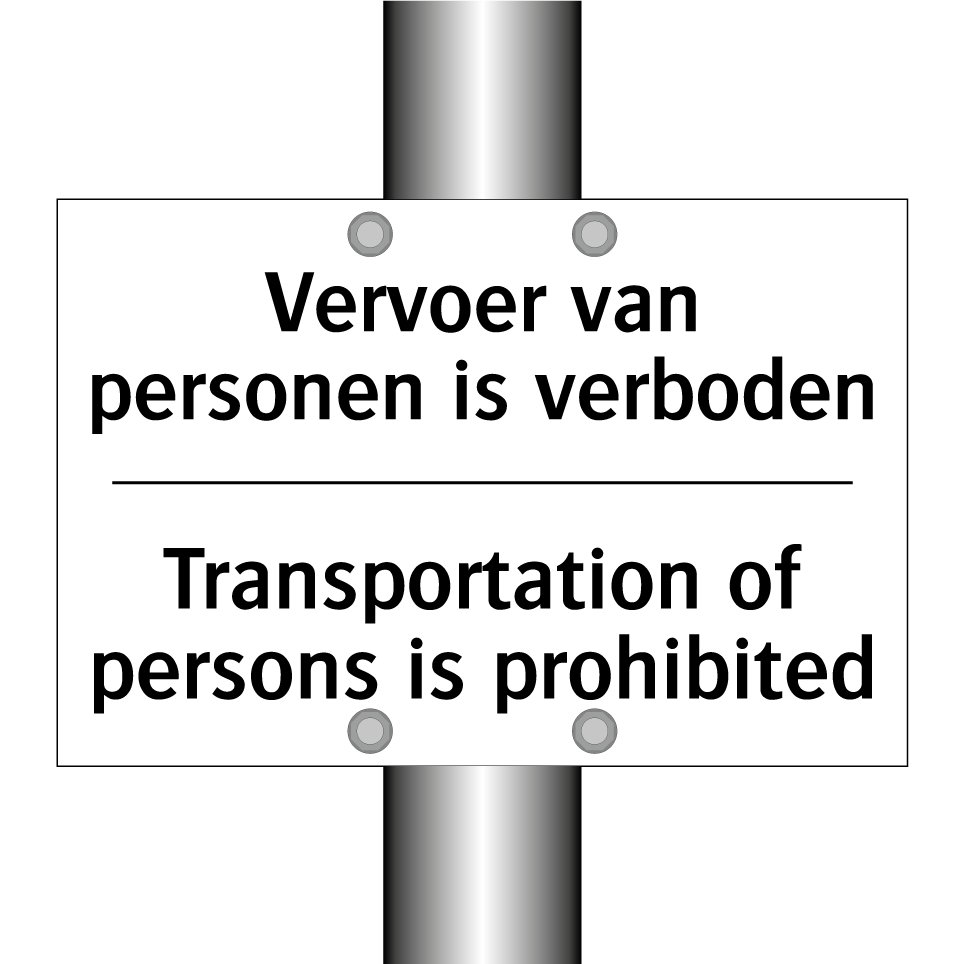 Verbodsbord met de tekst Vervoer van personen is verboden en in het Engels: Transportation of persons is prohibited