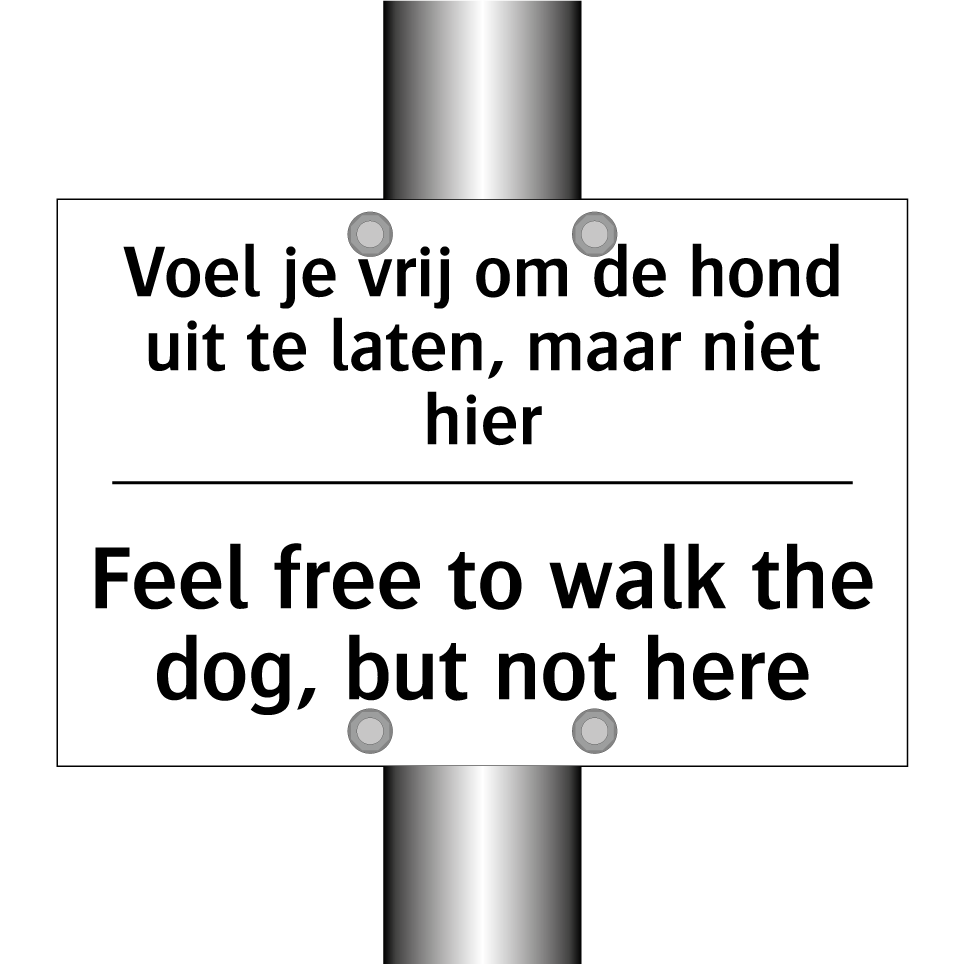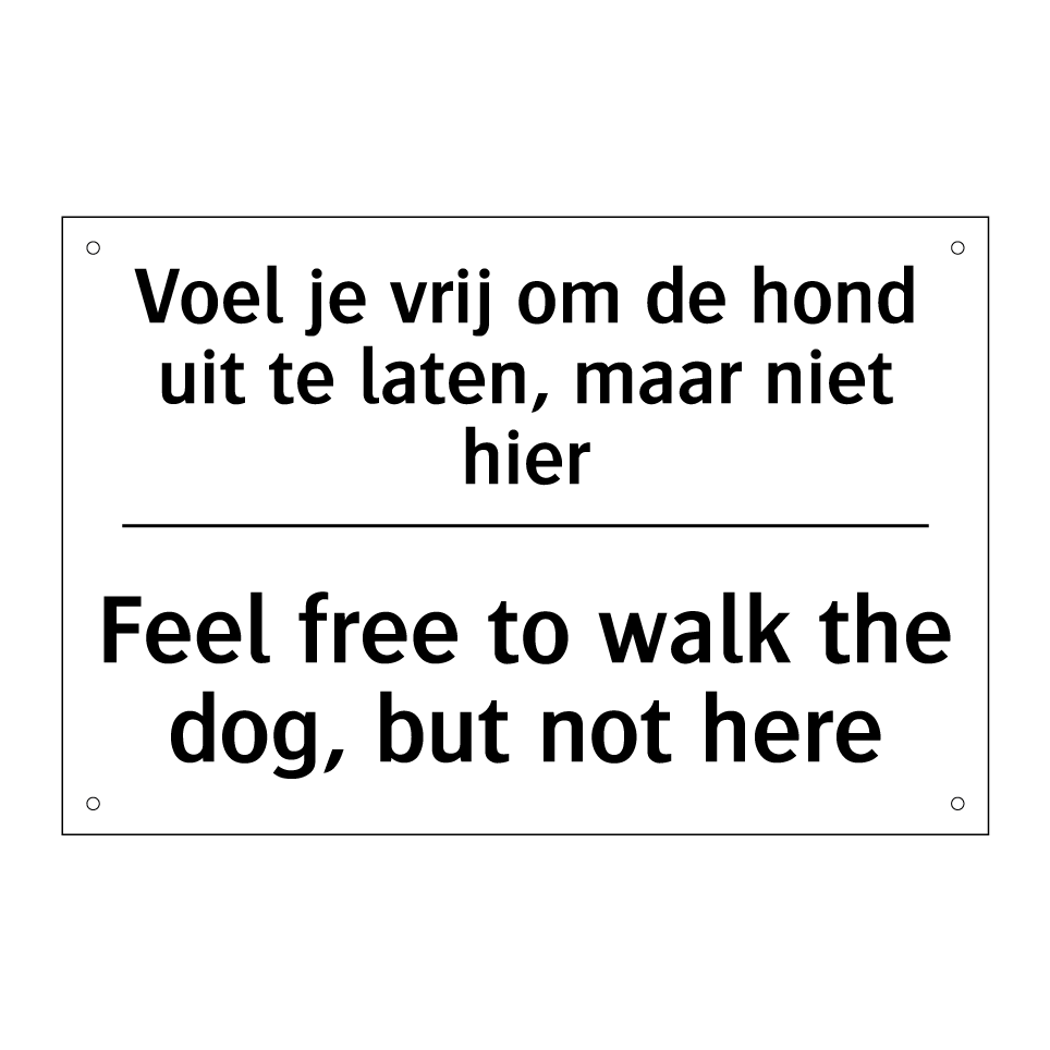 Verbodsbord met de tekst Voel je vrij om de hond uit te laten, maar niet hier en in het Engels: Feel free to walk the dog, but not here