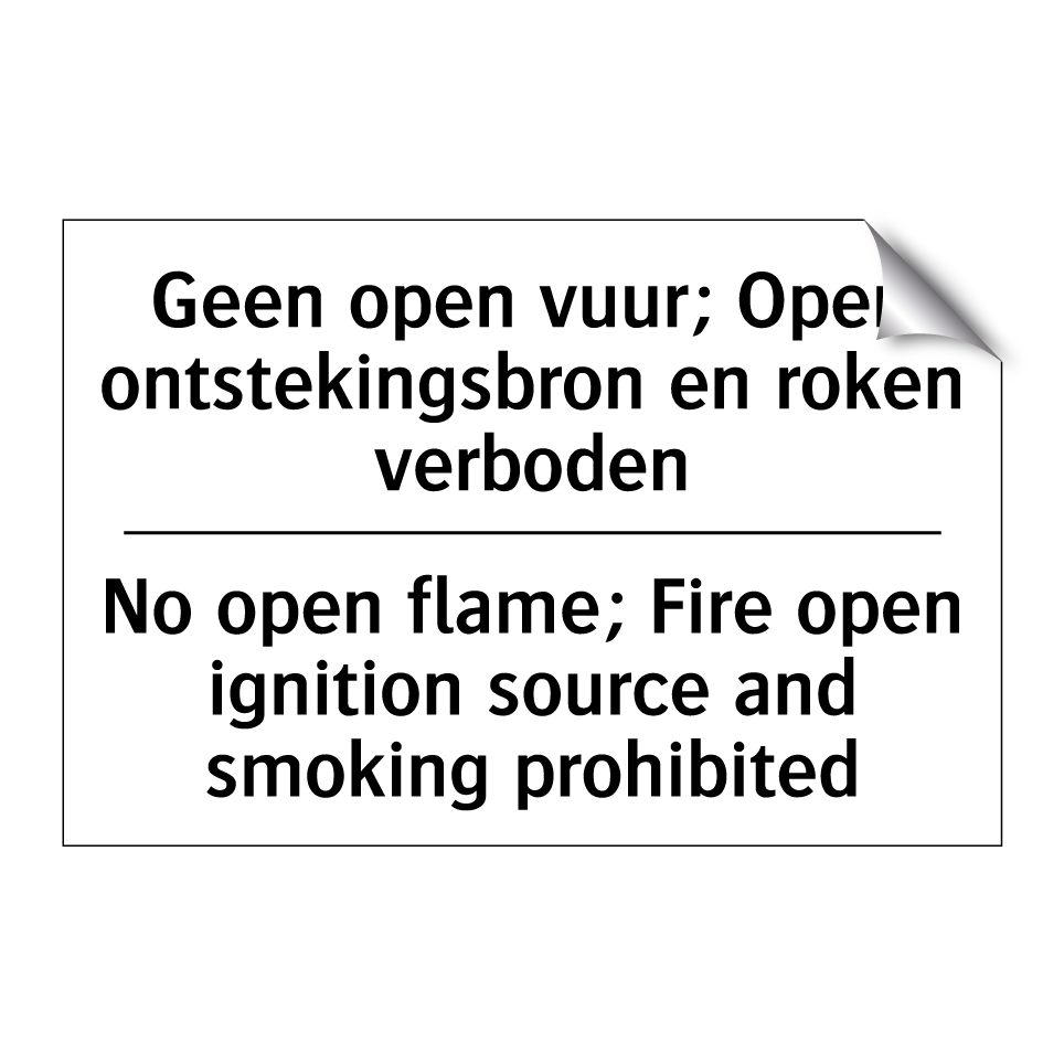 Verbodsbord met de tekst Geen open vuur; Open ontstekingsbron en roken verboden en in het Engels: No open flame; Fire open ignition source and smoking prohibited