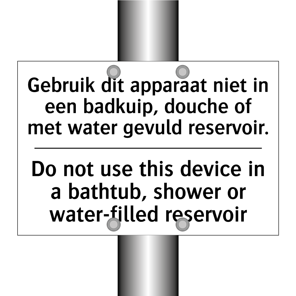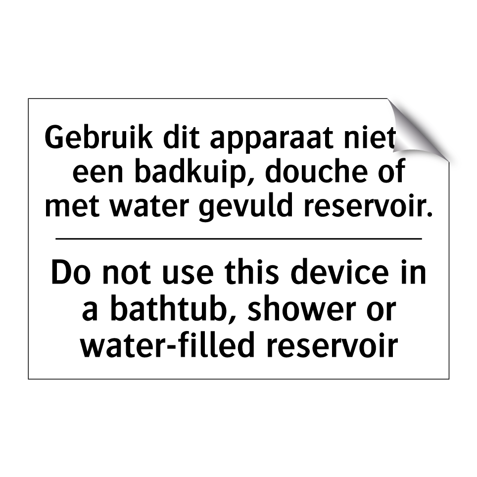 Verbodsbord met de tekst Gebruik dit apparaat niet in een badkuip, douche of met water gevuld reservoir. en in het Engels: Do not use this device in a bathtub, shower or water-filled reservoir
