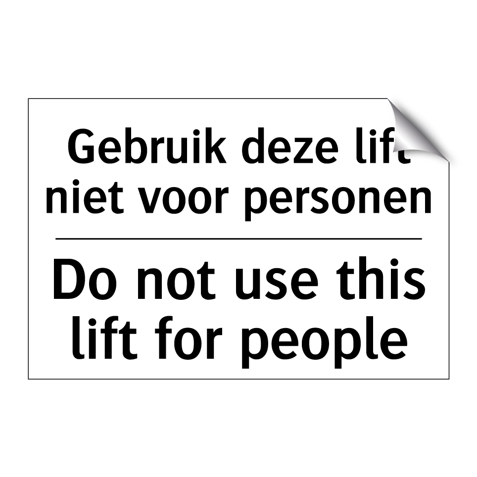 Verbodsbord met de tekst Gebruik deze lift niet voor personen en in het Engels: Do not use this lift for people