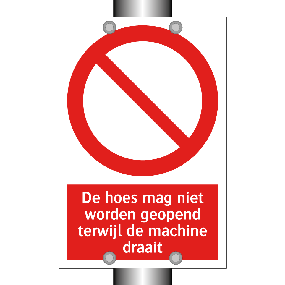 Verbodsbord met de tekst De hoes mag niet worden geopend terwijl de machine draait