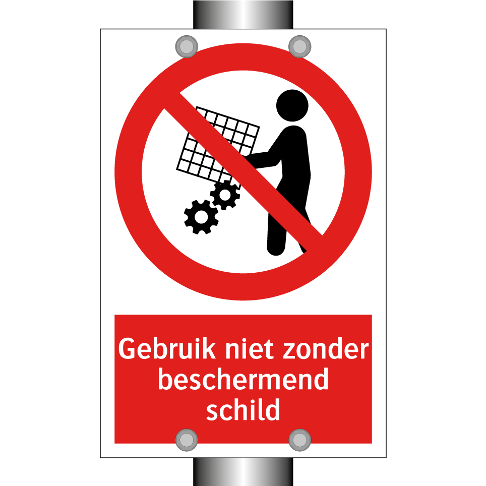 Verbodsbord met de tekst Gebruik niet zonder beschermend schild