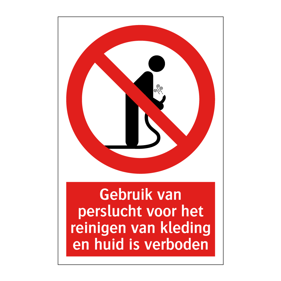 Verbodsbord met de tekst Gebruik van perslucht voor het reinigen van kleding en huid is verboden