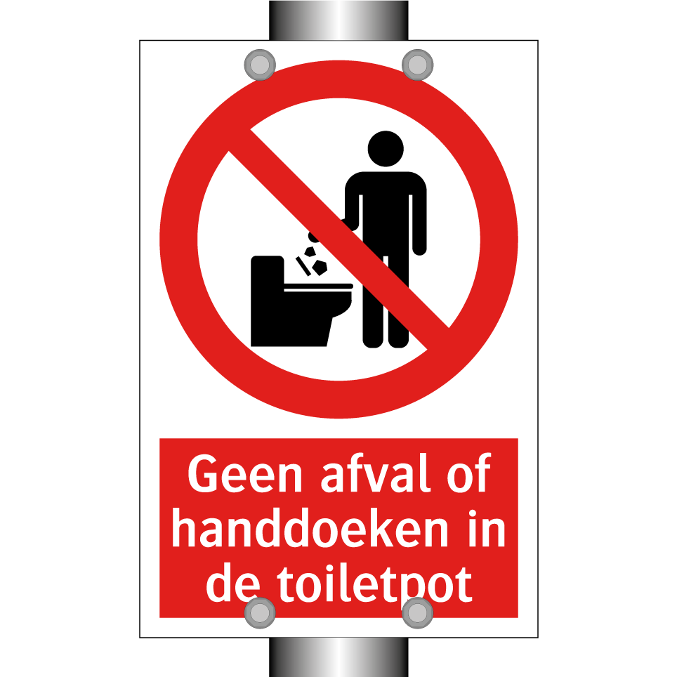 Verbodsbord met de tekst Geen afval of handdoeken in de toiletpot