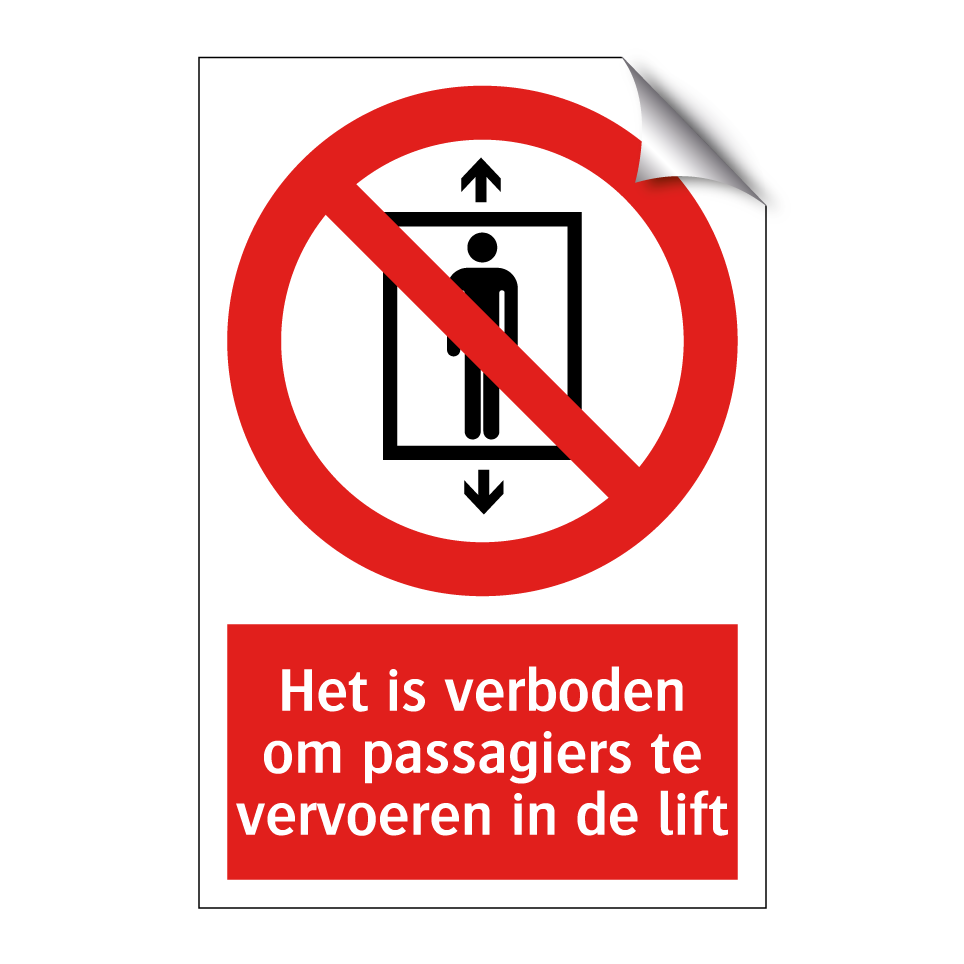 Deze opvallende verbodsbord is essentieel voor de veiligheid in gebouwen met liften. Het bord waarschuwt duidelijk dat het niet toegestaan is om passagiers in de lift te vervoeren, wat helpt om ongelukken en overbelasting te voorkomen. Ideaal voor gebruik in kantoorgebouwen, appartementencomplexen en openbare instellingen, waar het belangrijk is om de liftregels te handhaven. Door de strategische plaatsing bij liftdeuren en in liftlobby's, zorgt dit bord ervoor dat iedereen zich bewust is van de geldende voorschriften. De heldere rode achtergrond en witte tekst met symbool maken het bord goed zichtbaar en begrijpelijk voor alle gebruikers.