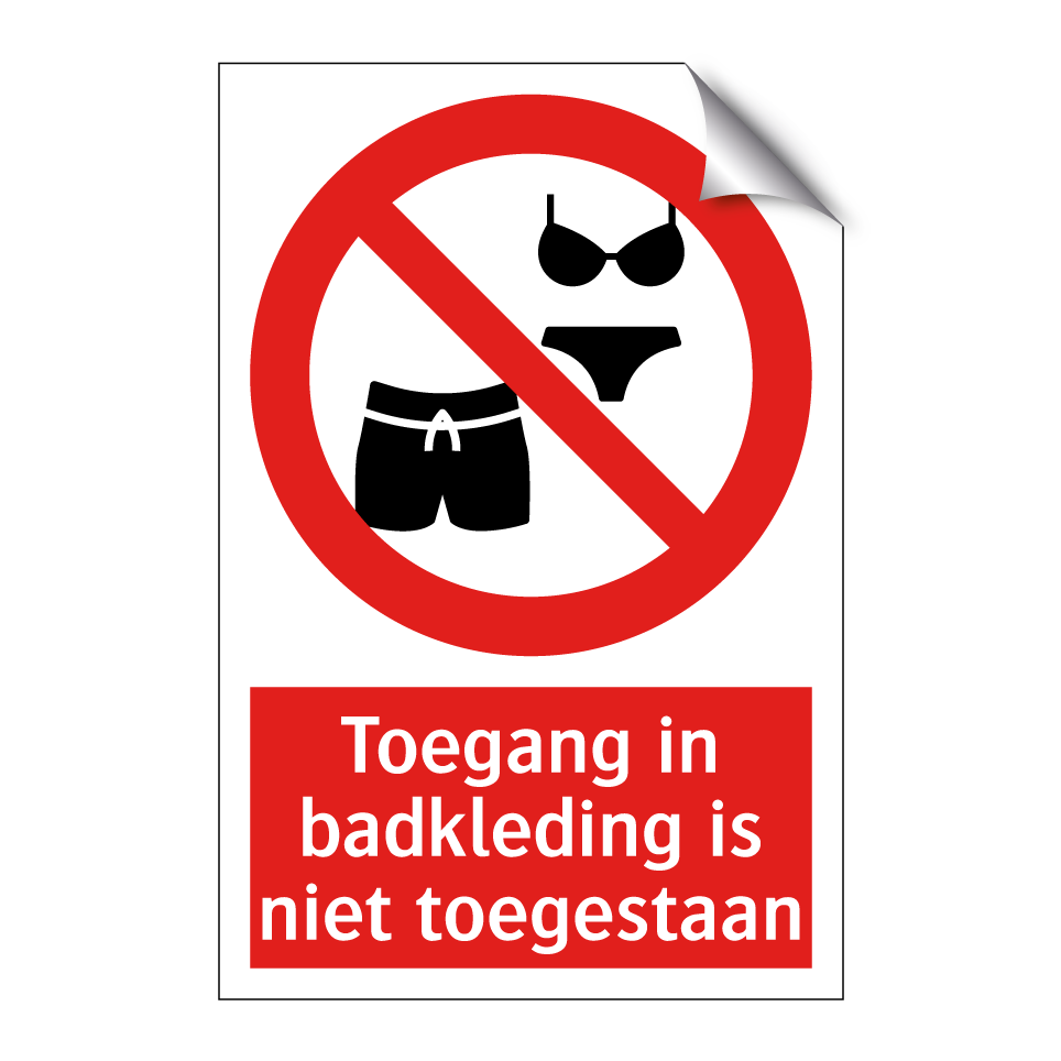 Deze opvallende verbodsbord is ideaal voor gebruik in zwembaden, sauna's en wellnesscentra. Het bord geeft duidelijk aan dat het dragen van badkleding niet is toegestaan, wat helpt om de gewenste kledingvoorschriften te handhaven. Plaats deze bord bij de ingang van kleedruimtes, douches of andere faciliteiten waar specifieke kledingregels gelden. Door de heldere rode achtergrond en witte tekst is de boodschap direct zichtbaar en begrijpelijk voor bezoekers. Dit verbodsbord draagt bij aan een georganiseerde en ordelijke omgeving, waardoor misverstanden worden voorkomen en de regels duidelijk worden gecommuniceerd.
