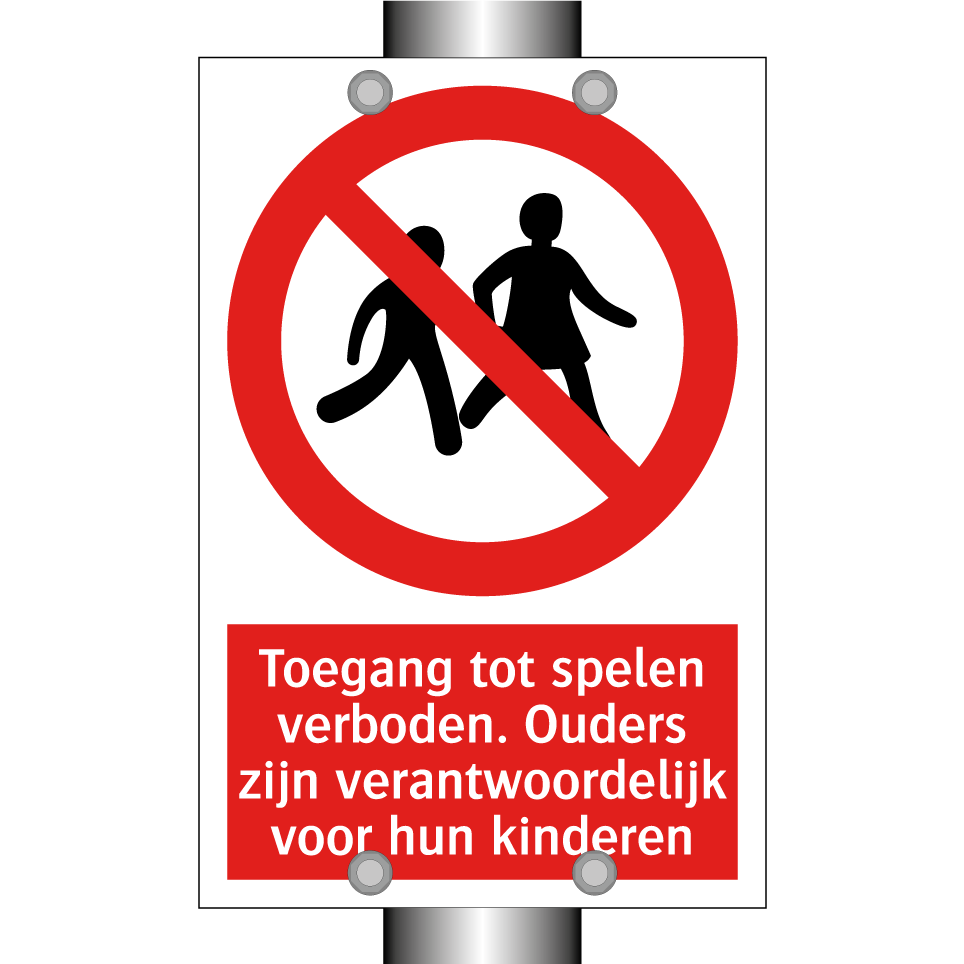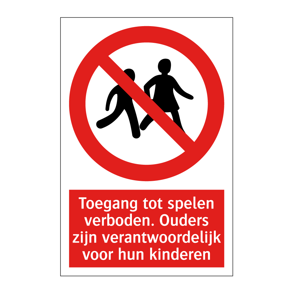 Verbodsbord met de tekst Toegang tot spelen verboden. Ouders zijn verantwoordelijk voor hun kinderen