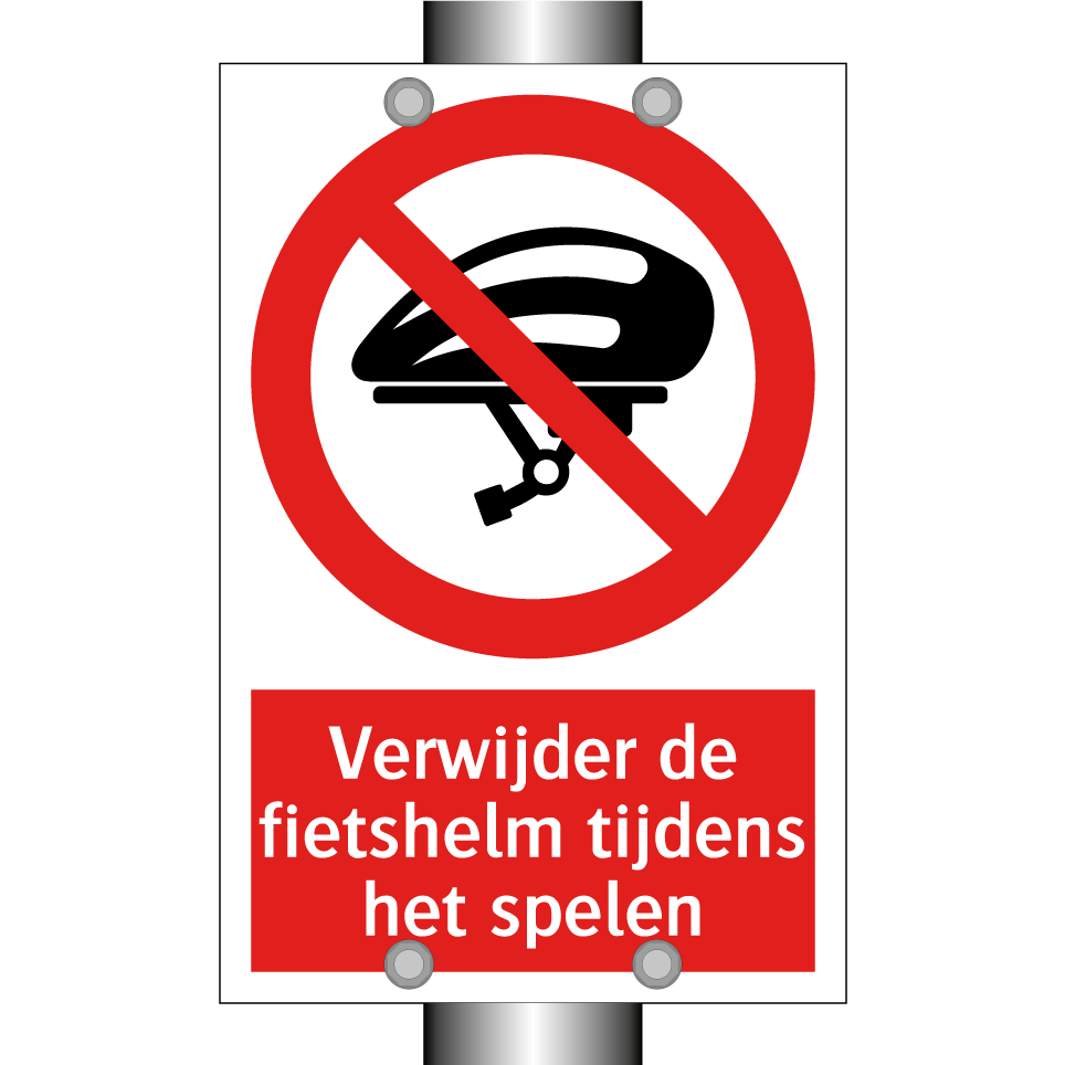 Verbodsbord met de tekst Verwijder de fietshelm tijdens het spelen