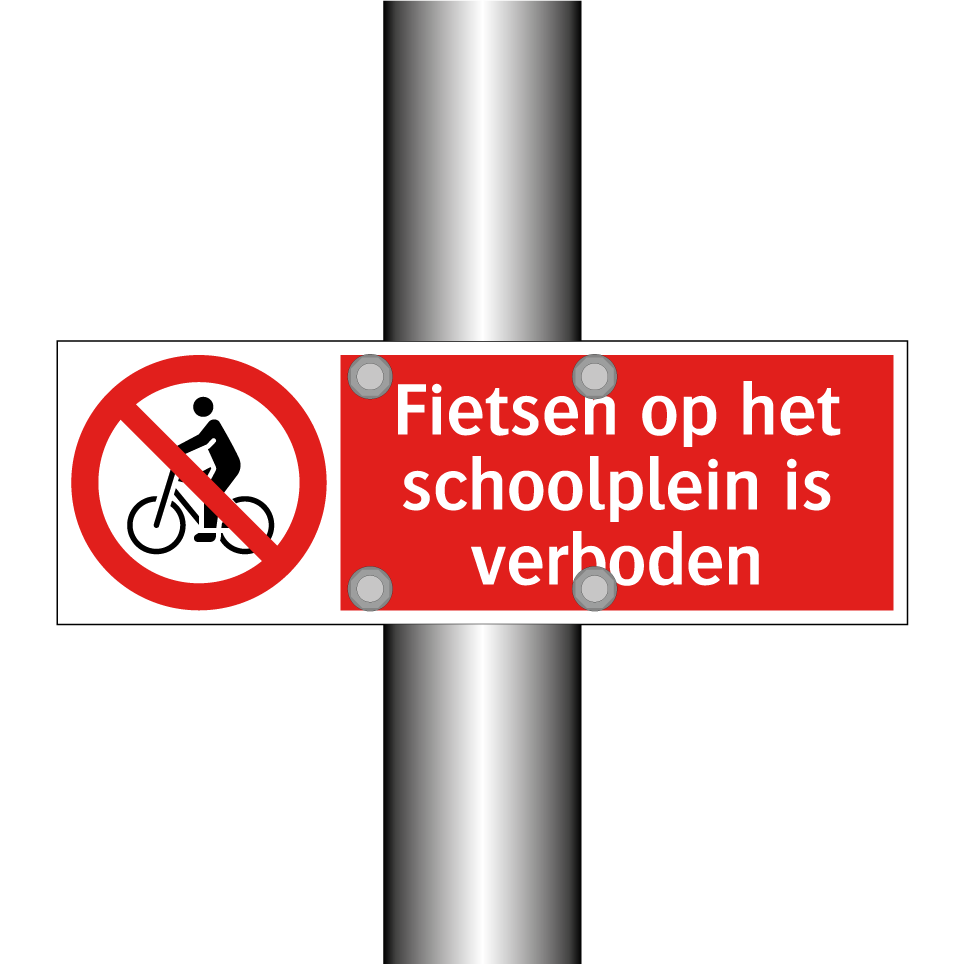 Verbodsbord met de tekst Fietsen op het schoolplein is verboden