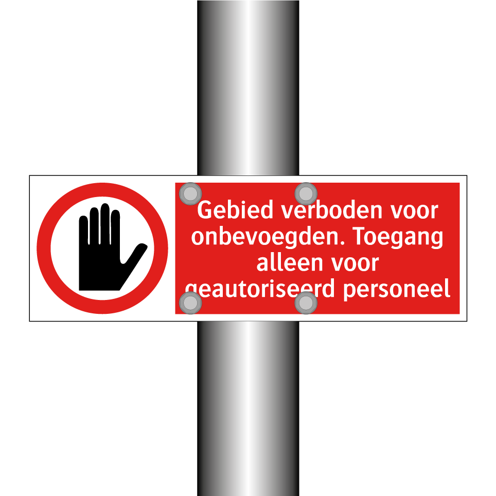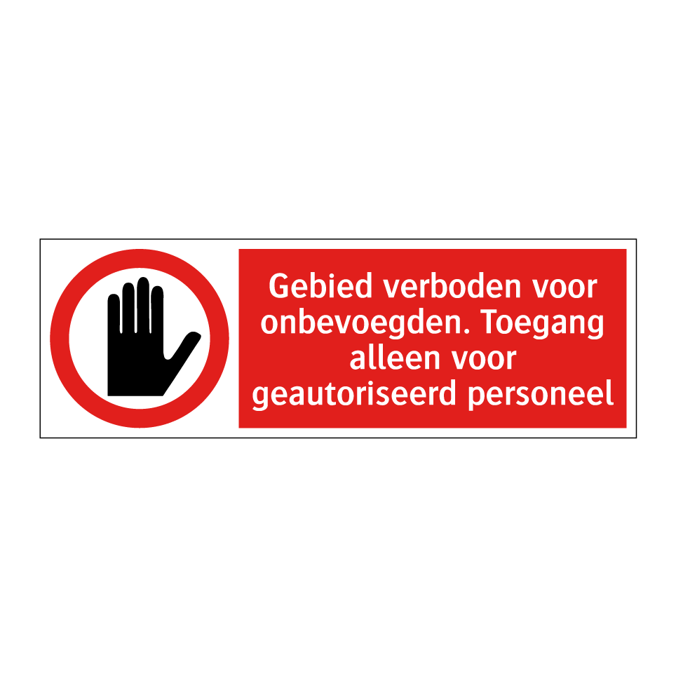Verbodsbord met de tekst Gebied verboden voor onbevoegden. Toegang alleen voor geautoriseerd personeel