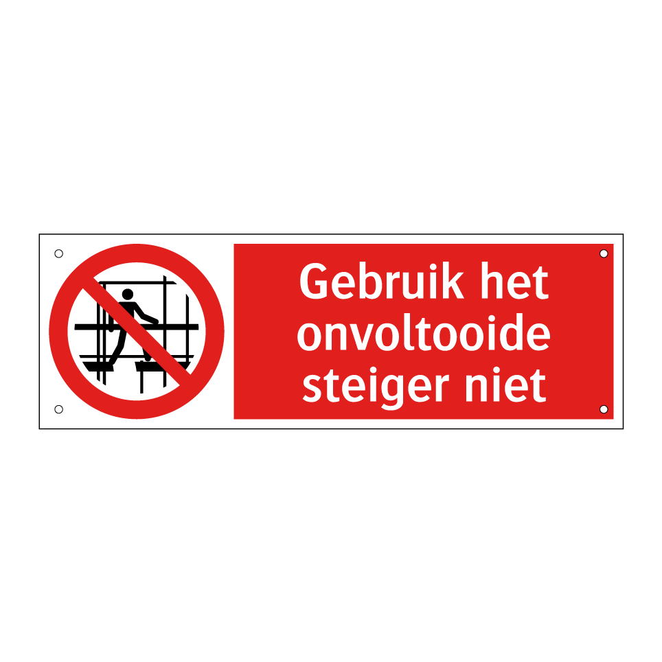 Deze opvallende verbodsbord is essentieel voor de veiligheid op bouwplaatsen en andere locaties waar steigers worden gebruikt. Het waarschuwt duidelijk tegen het gebruik van onvoltooide steigers, waardoor ongelukken en verwondingen worden voorkomen. Plaats deze waarschuwingsbord op strategische plekken zoals ingangen van bouwterreinen, nabij steigerconstructies of op andere risicovolle locaties. Door de heldere rode achtergrond en witte tekst is de boodschap direct zichtbaar en begrijpelijk voor iedereen. Deze verbodsbord is een onmisbaar onderdeel van uw veiligheidsmaatregelen en helpt bij het handhaven van een veilige werkomgeving.