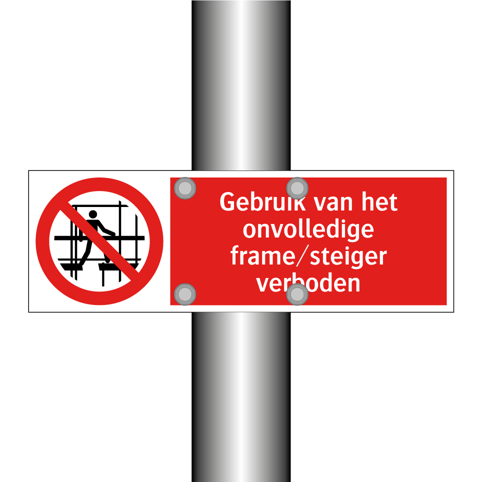 Verbodsbord met de tekst Gebruik van het onvolledige frame/steiger verboden