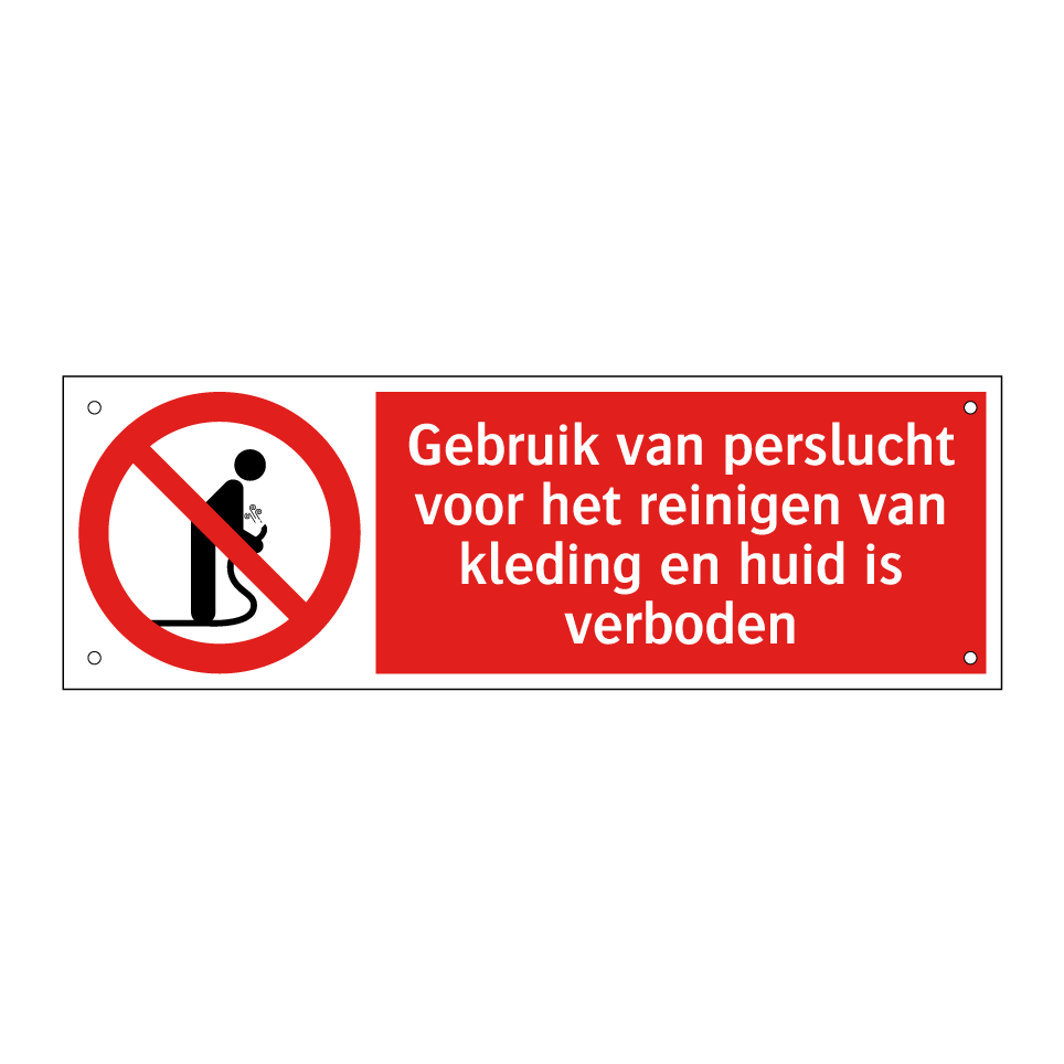 Verbodsbord met de tekst Gebruik van perslucht voor het reinigen van kleding en huid is verboden