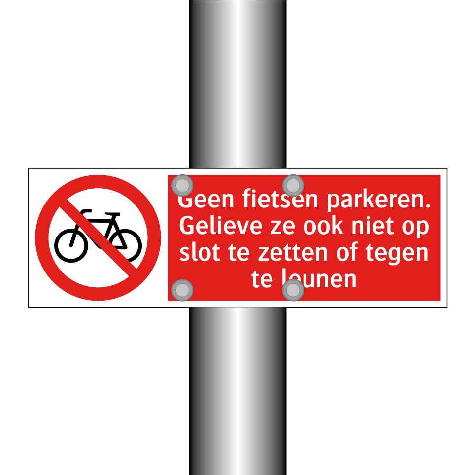 Verbodsbord met de tekst Geen fietsen parkeren. Gelieve ze ook niet op slot te zetten of tegen te leunen