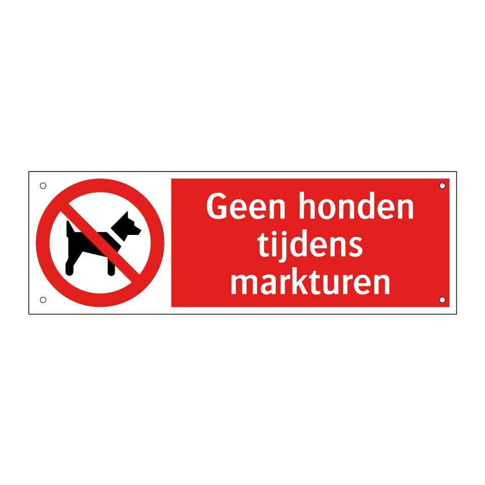 Verbodsbord met de tekst Geen honden tijdens markturen