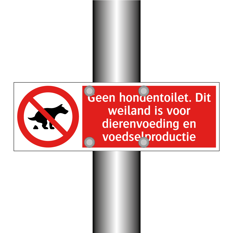 Verbodsbord met de tekst Geen hondentoilet. Dit weiland is voor dierenvoeding en voedselproductie