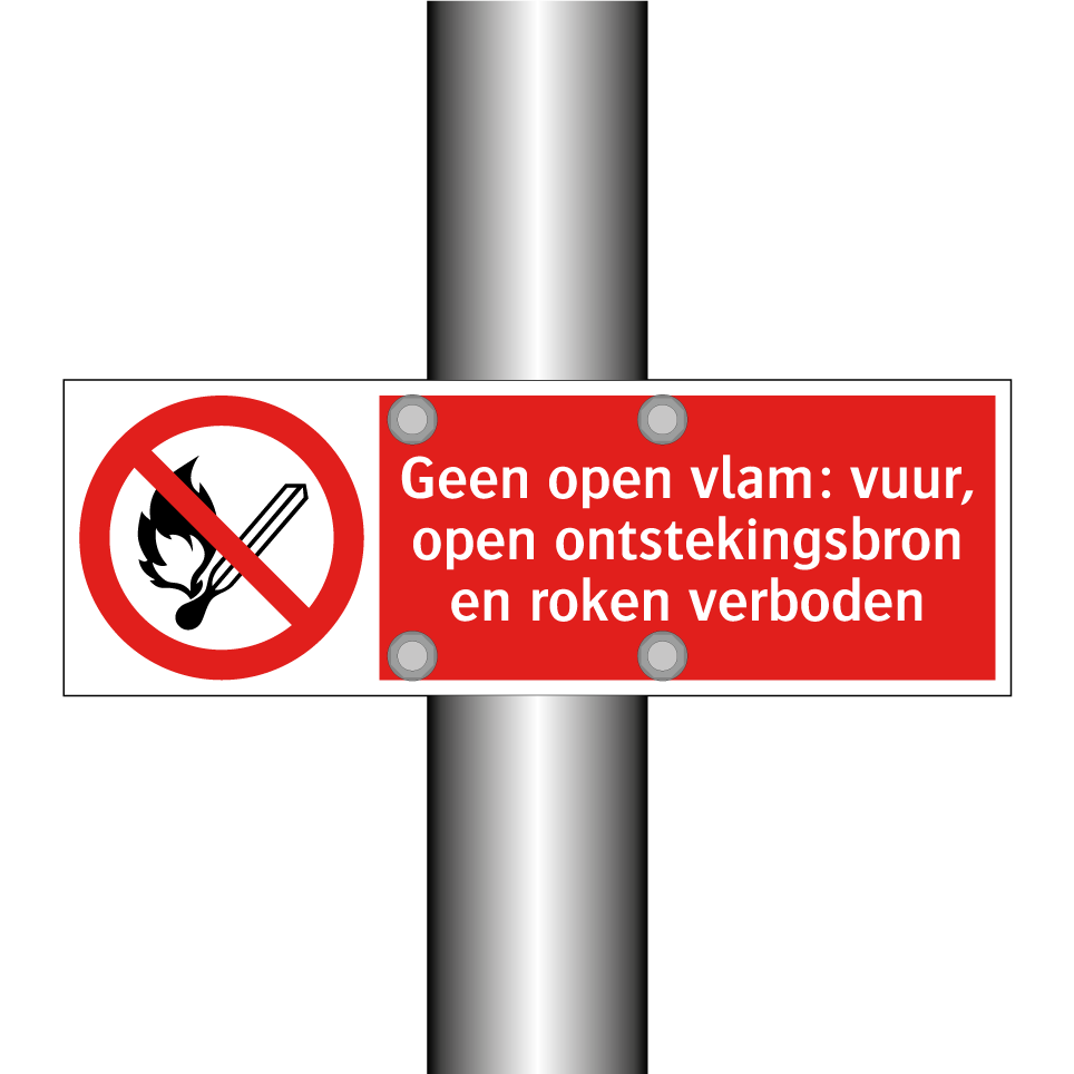 Verbodsbord met de tekst Geen open vlam: vuur, open ontstekingsbron en roken verboden