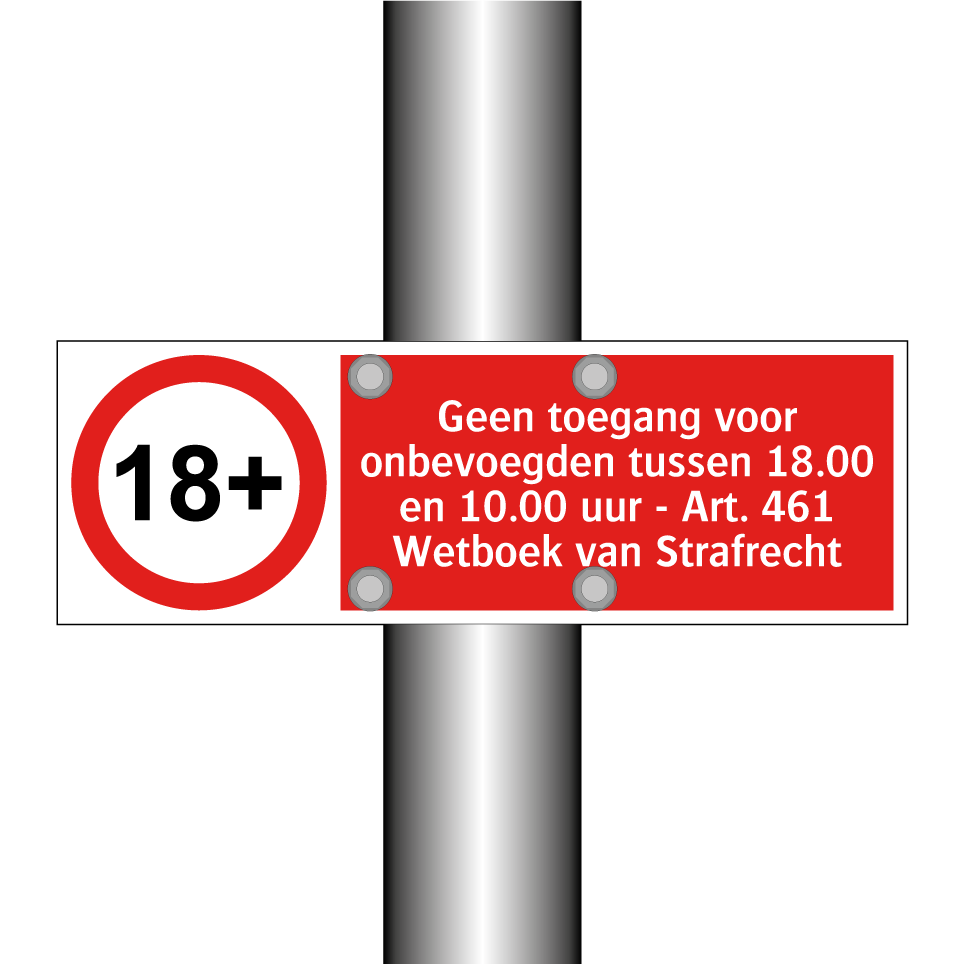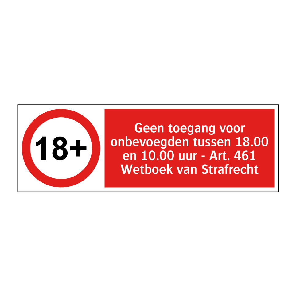 Verbodsbord met de tekst Geen toegang voor onbevoegden tussen 18.00 en 10.00 uur - Art. 461 Wetboek van Strafrecht