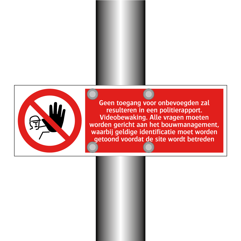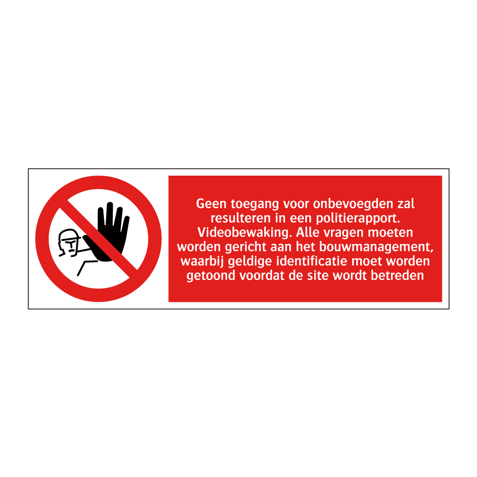 Verbodsbord met de tekst Geen toegang voor onbevoegden zal resulteren in een politierapport. Videobewaking. Alle vragen moeten worden gericht aan het bouwmanagement, waarbij geldige identificatie moet worden getoond voordat de site wordt betreden