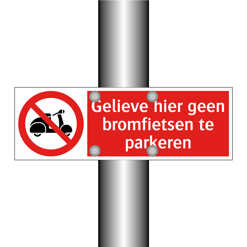Verbodsbord met de tekst Gelieve hier geen bromfietsen te parkeren