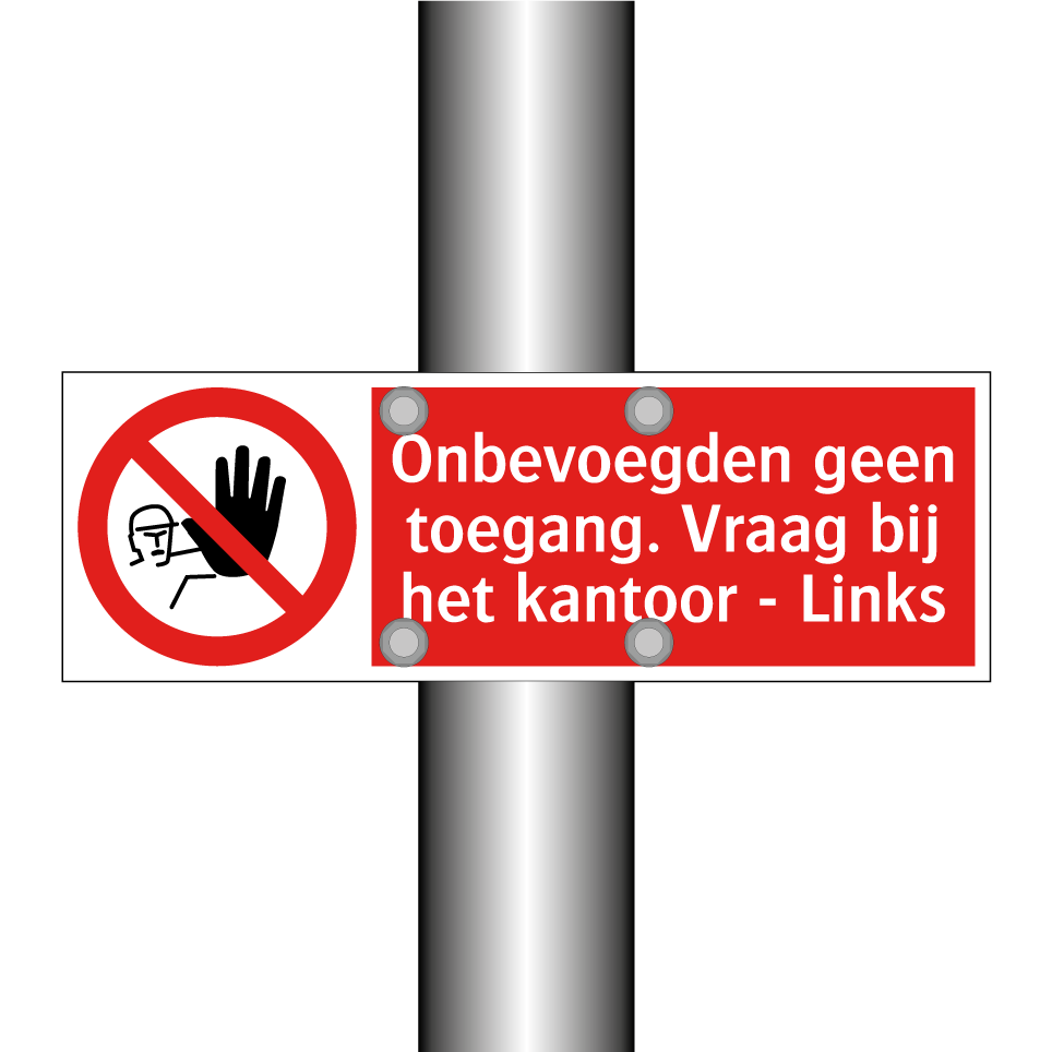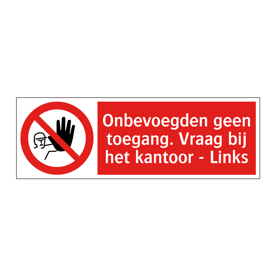Verbodsbord met de tekst Onbevoegden geen toegang. Vraag bij het kantoor - Links