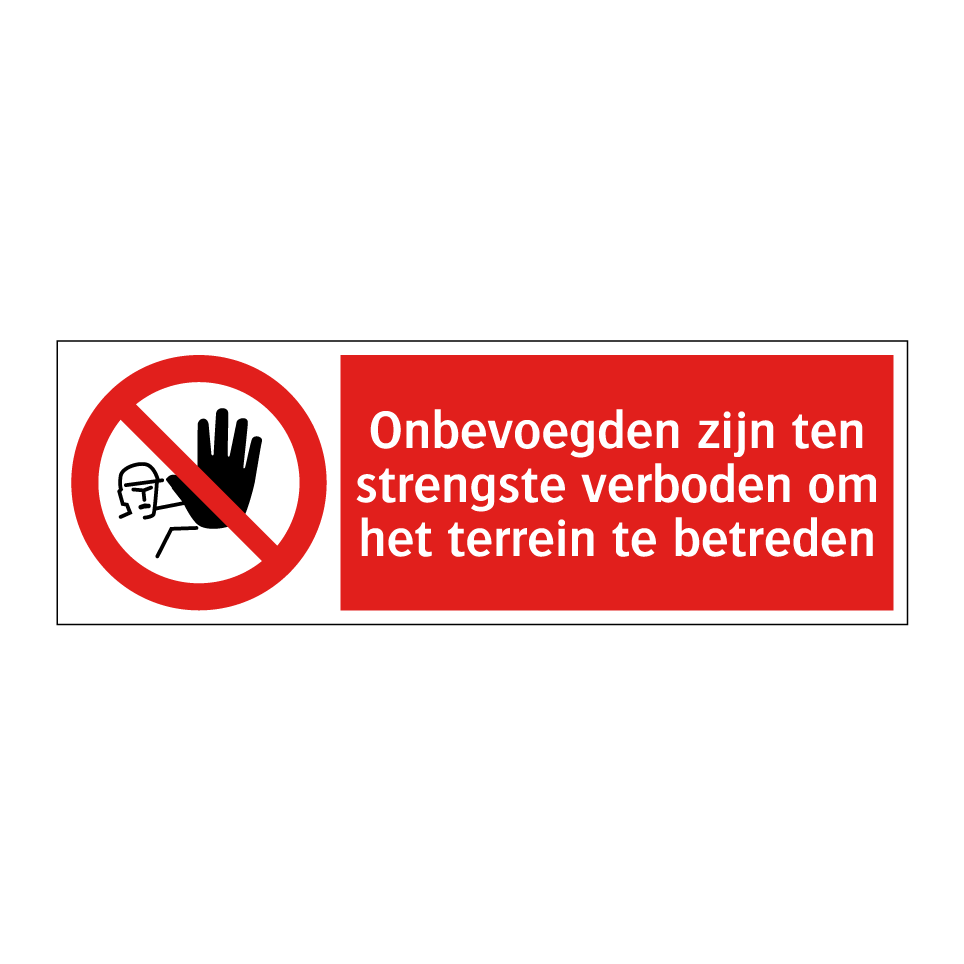 Deze opvallende verbodsbord is essentieel voor het waarborgen van de veiligheid en het handhaven van de regels op uw terrein. Met zijn rode achtergrond en duidelijke witte tekst, gecombineerd met een herkenbaar symbool, communiceert deze bord effectief dat onbevoegden geen toegang hebben. Ideaal voor gebruik bij ingangen van bouwplaatsen, privéterreinen, en andere gebieden waar toegang strikt gereguleerd moet worden. Door deze bord strategisch te plaatsen, voorkomt u ongewenste bezoekers en beschermt u uw eigendom. Het is een onmisbaar hulpmiddel voor het creëren van een veilige en gecontroleerde omgeving.