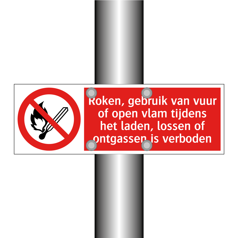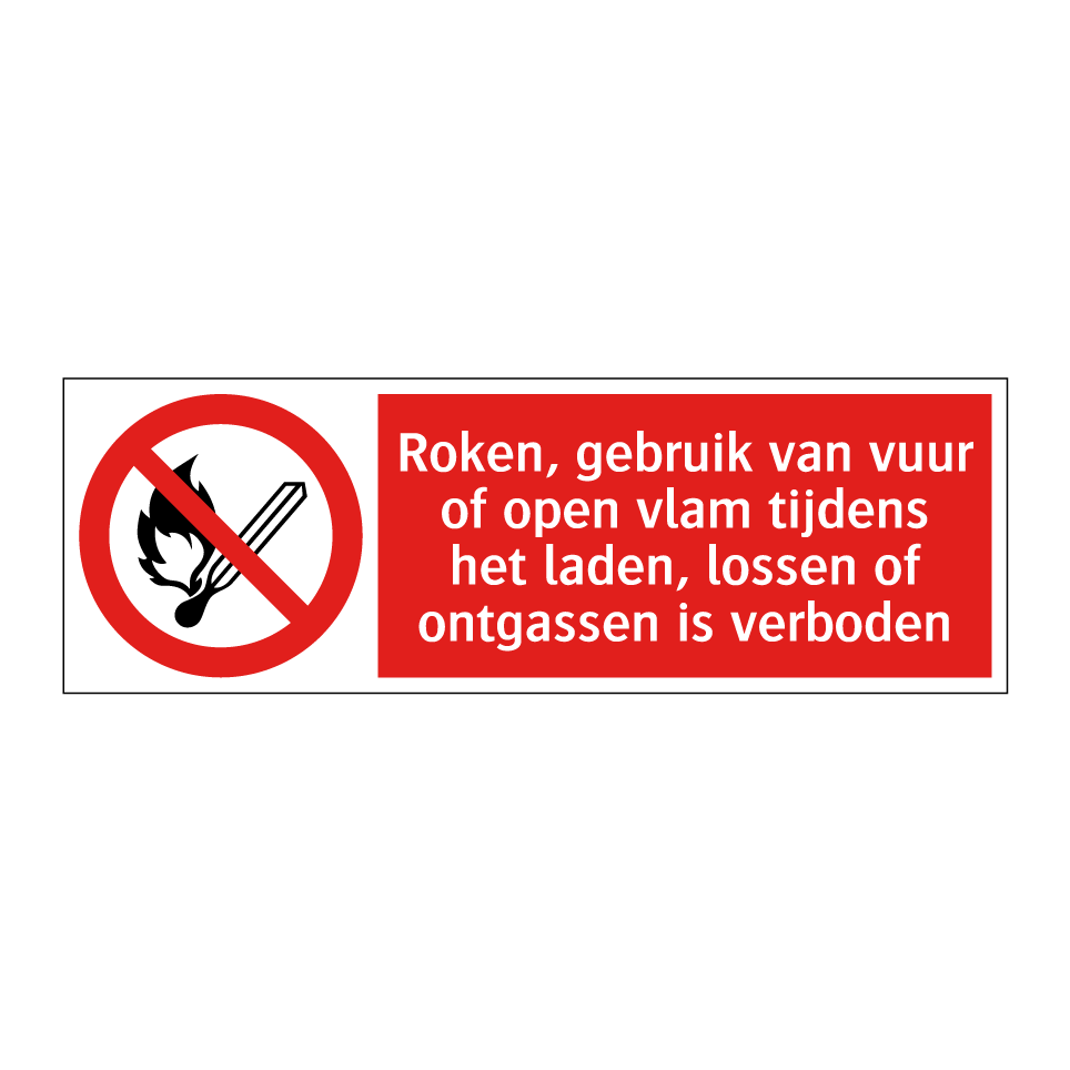 Deze opvallende verbodsbord is essentieel voor het waarborgen van veiligheid op locaties waar gevaarlijke stoffen worden behandeld. Het is ideaal voor gebruik in industriële omgevingen zoals havens, magazijnen en fabrieken, waar het laden, lossen of ontgassen plaatsvindt. Door de duidelijke rode achtergrond en witte tekst met een herkenbaar symbool, trekt het onmiddellijk de aandacht en waarschuwt het effectief tegen het gebruik van vuur, roken of open vlammen. Plaats deze waarschuwingsbord op strategische plekken zoals ingangen, laadperrons of nabij opslagruimtes om risico's te minimaliseren en een veilige werkomgeving te bevorderen.