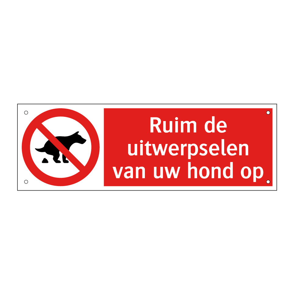 Deze opvallende verbodsbord is een essentiële toevoeging voor openbare ruimtes en woonwijken. Het bord dient als een duidelijke herinnering aan hondenbezitters om verantwoordelijk te zijn en de omgeving schoon te houden. Ideaal voor parken, trottoirs, speeltuinen en andere drukbezochte gebieden waar hygiëne van groot belang is. Door de heldere rode achtergrond en de duidelijke witte tekst met symbool, trekt het bord onmiddellijk de aandacht en communiceert het effectief de boodschap. Plaats dit bord op strategische locaties om ervoor te zorgen dat iedereen zich bewust is van de regels en bijdraagt aan een schone en aangename omgeving voor iedereen.