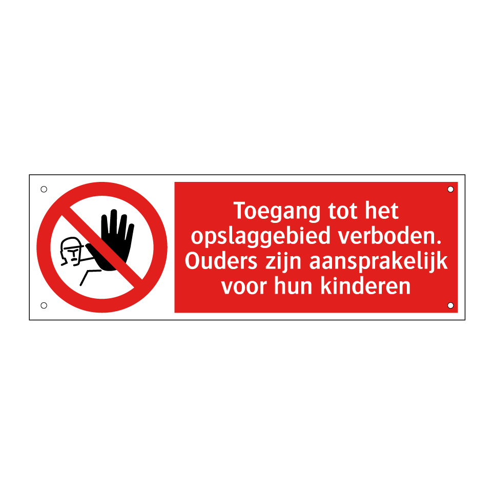 Deze opvallende verbodsbord is essentieel voor het waarborgen van de veiligheid in opslagruimtes. Het bord is ontworpen om ongeautoriseerde toegang te voorkomen en waarschuwt duidelijk dat ouders verantwoordelijk zijn voor hun kinderen. Ideaal voor gebruik in magazijnen, opslagfaciliteiten en andere industriële omgevingen waar veiligheid voorop staat. Door de strategische plaatsing bij ingangen en doorgangen, helpt dit bord om potentiële risico's te minimaliseren en de naleving van veiligheidsvoorschriften te bevorderen. De heldere rode achtergrond en witte tekst zorgen ervoor dat de boodschap niet over het hoofd wordt gezien, waardoor het een onmisbaar onderdeel is van uw veiligheidsmaatregelen.