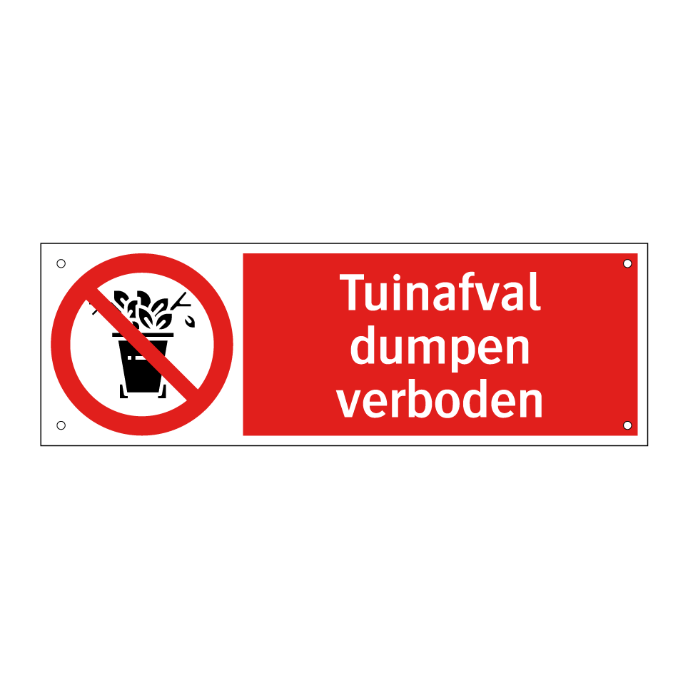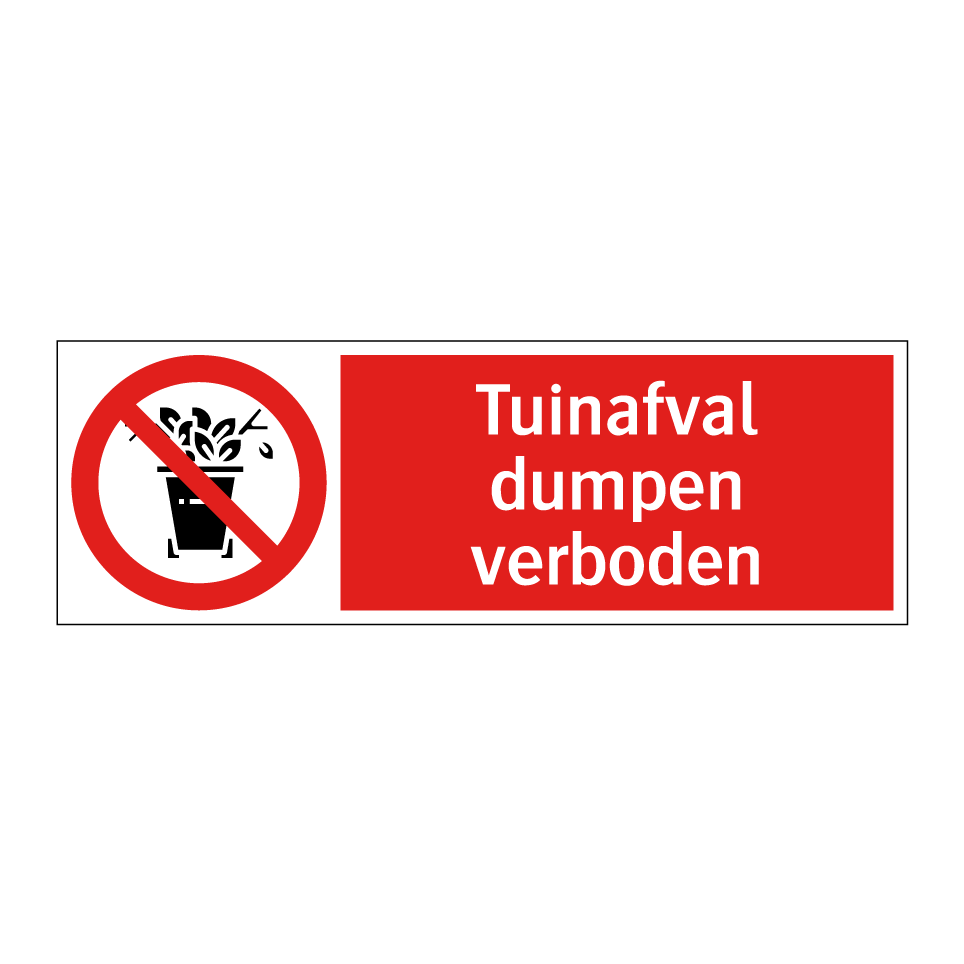 Deze opvallende verbodsbord is essentieel voor het handhaven van netheid en orde in openbare en privéruimtes. Ideaal voor gebruik in parken, tuinen, en andere groene zones, waarschuwt deze bord bezoekers om geen tuinafval achter te laten. Door de duidelijke rode achtergrond en witte tekst met een herkenbaar symbool, trekt het onmiddellijk de aandacht en communiceert het effectief het verbod. Plaats deze bord op strategische locaties zoals ingangen van parken, langs wandelpaden of bij afvalverzamelpunten om ongewenst gedrag te ontmoedigen en de omgeving schoon te houden. Perfect voor gemeenten, bedrijven en particulieren die een nette en georganiseerde omgeving willen behouden.