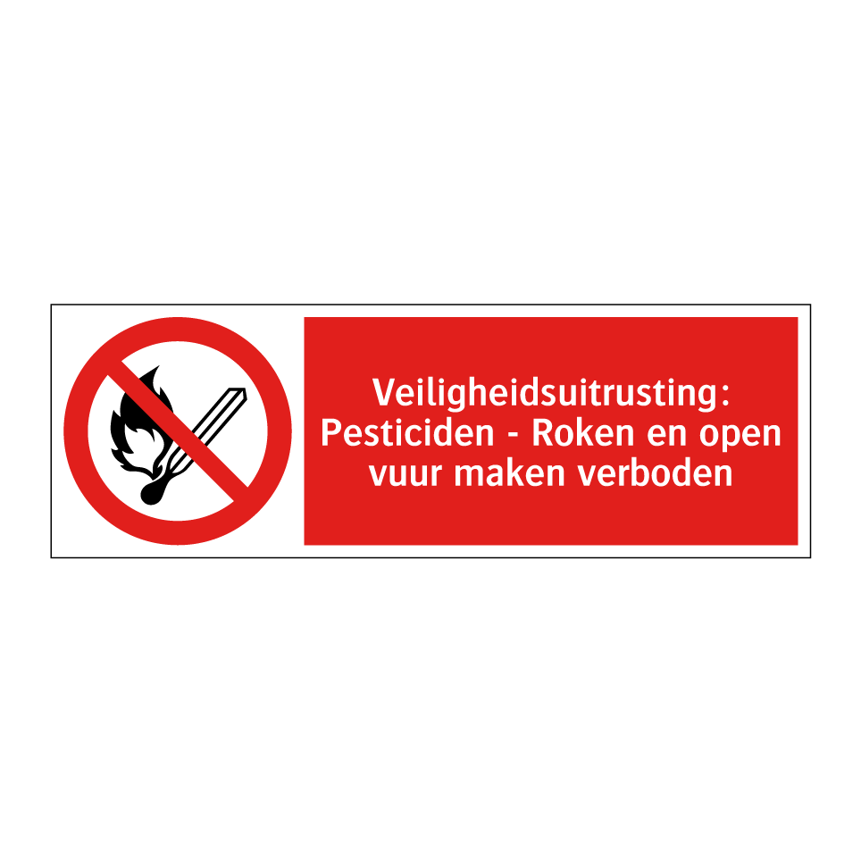Verbodsbord met de tekst Veiligheidsuitrusting: Pesticiden - Roken en open vuur maken verboden