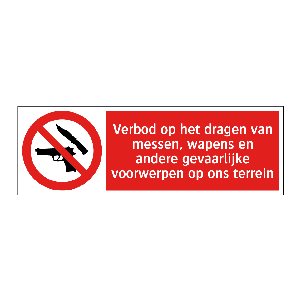 Verbodsbord met de tekst Verbod op het dragen van messen, wapens en andere gevaarlijke voorwerpen op ons terrein