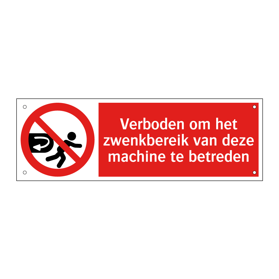 Verbodsbord met de tekst Verboden om het zwenkbereik van deze machine te betreden