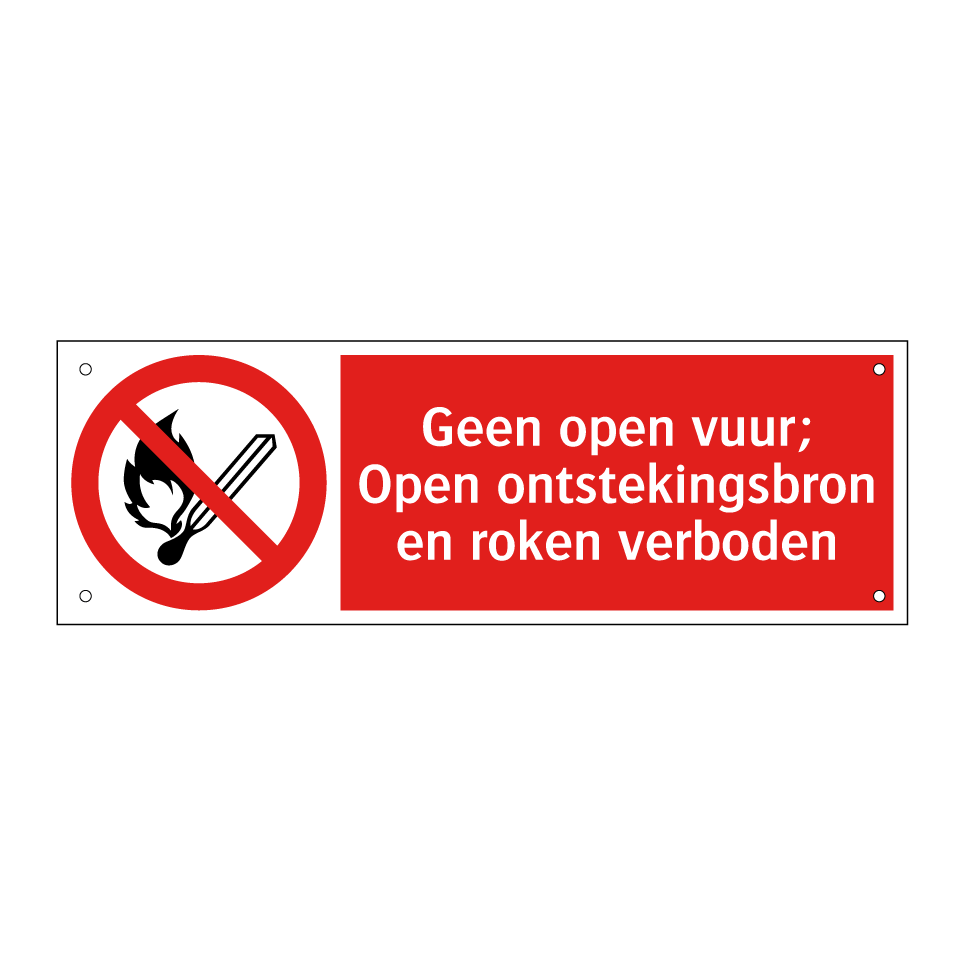 Deze opvallende verbodsbord is essentieel voor het waarborgen van de veiligheid in diverse omgevingen. Het bord is ideaal voor gebruik in ruimtes waar brandgevaar aanwezig is, zoals fabrieken, magazijnen en werkplaatsen. Door de duidelijke rode achtergrond en witte tekst met een herkenbaar symbool, communiceert het bord effectief het verbod op open vuur, ontstekingsbronnen en roken. Plaats dit bord op zichtbare plekken bij ingangen, in gangen of nabij risicovolle apparatuur om ervoor te zorgen dat iedereen op de hoogte is van de veiligheidsvoorschriften. Dit verbodsbord helpt bij het minimaliseren van risico's en het bevorderen van een veilige werkomgeving.