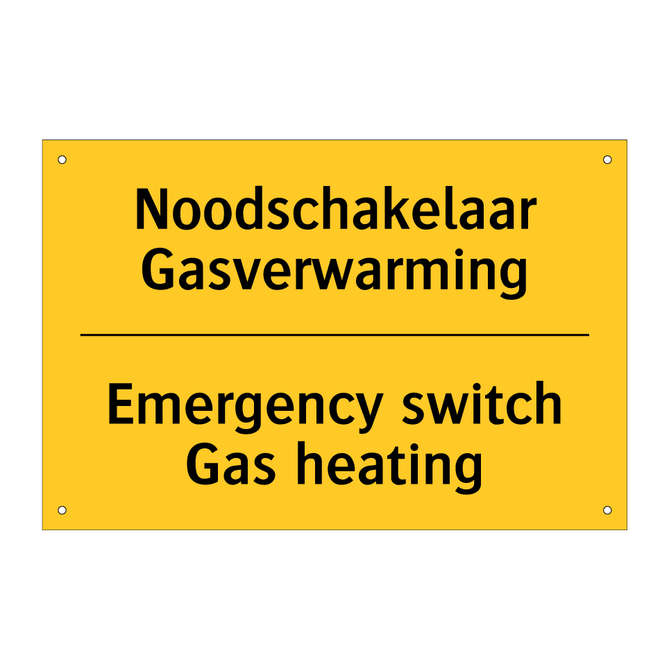 Waarschuwingsbord met de tekst Noodschakelaar Gasverwarming / Emergency switch Gas heating