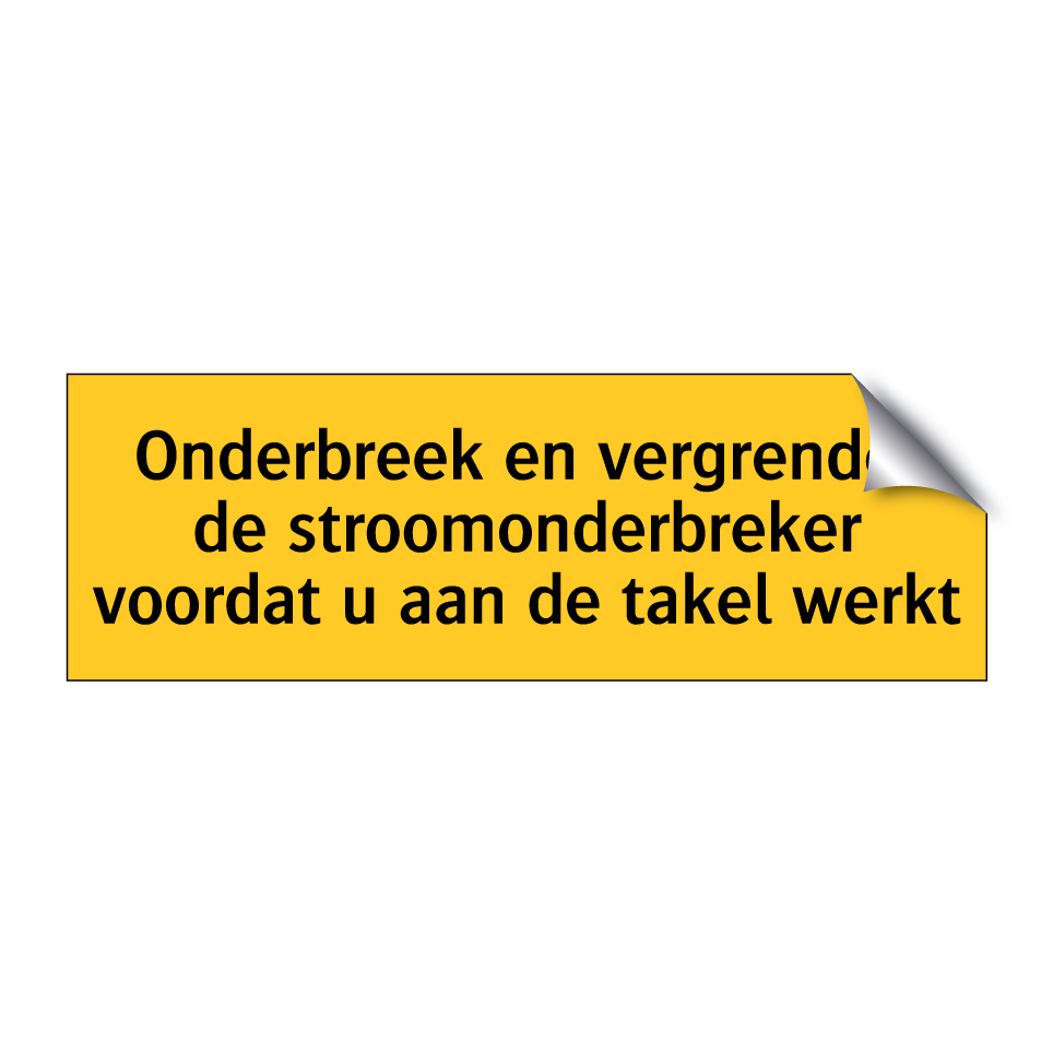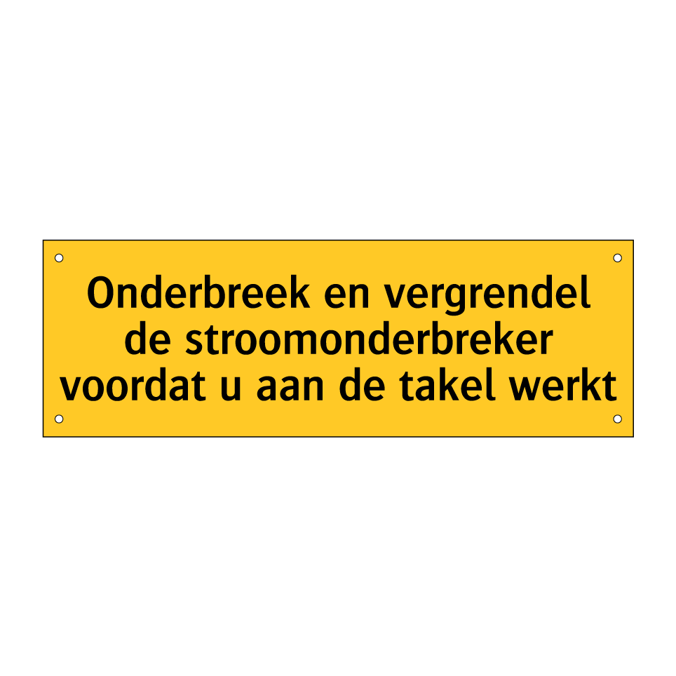 Waarschuwingsbord met de tekst Onderbreek en vergrendel de stroomonderbreker voordat u aan de takel werkt
