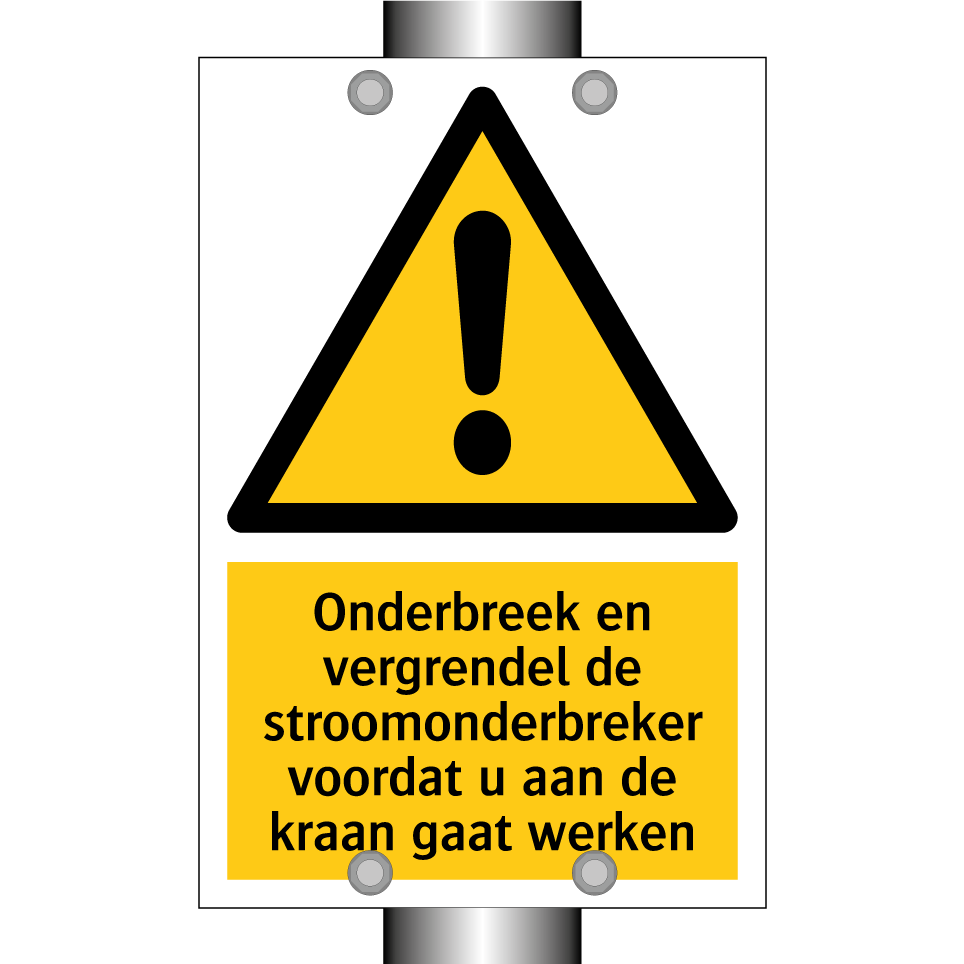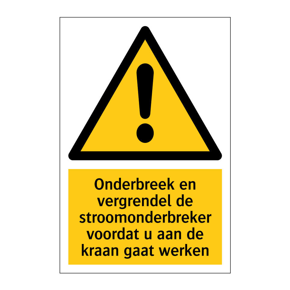 Waarschuwingsbord met de tekst Onderbreek en vergrendel de stroomonderbreker voordat u aan de kraan gaat werken